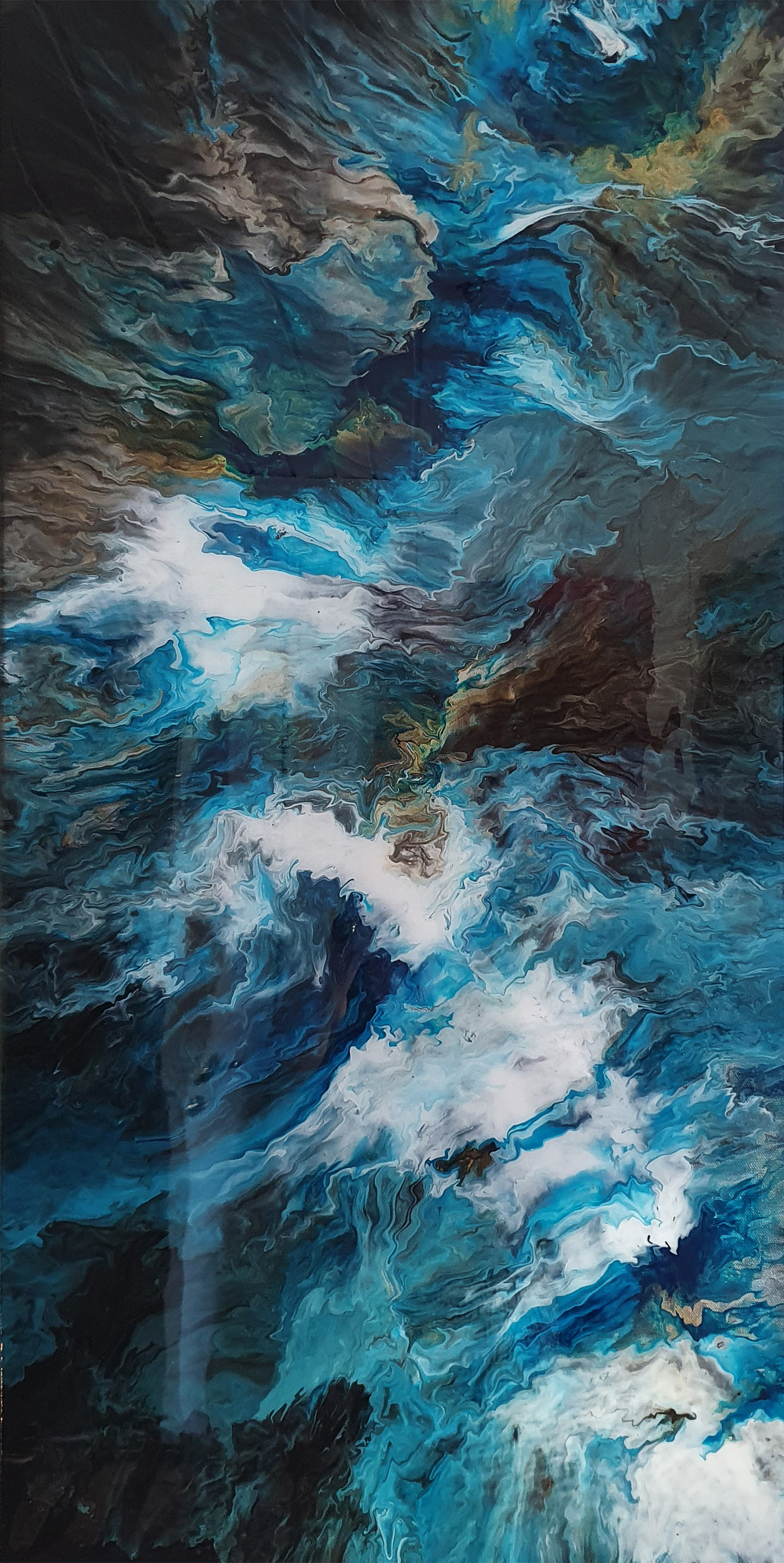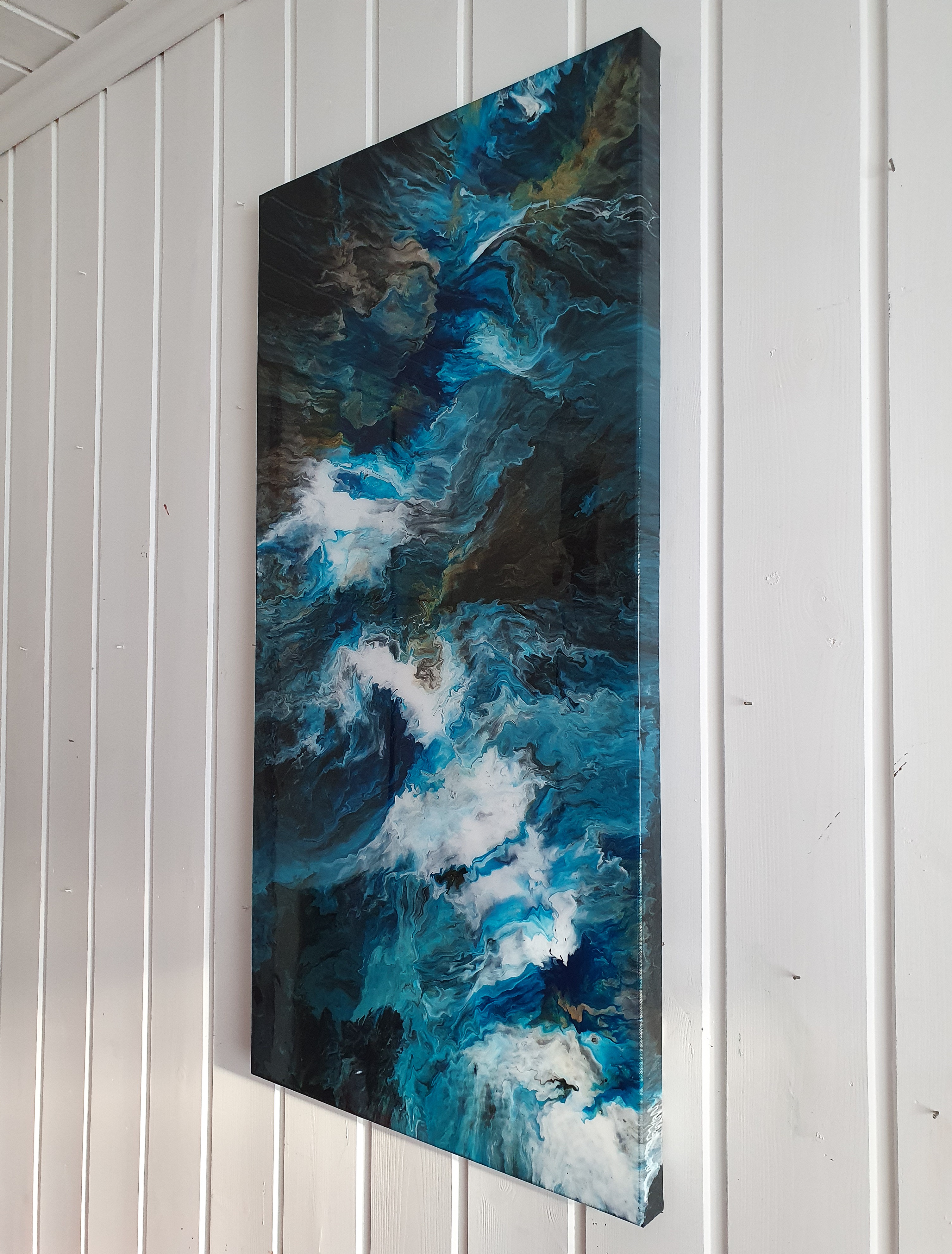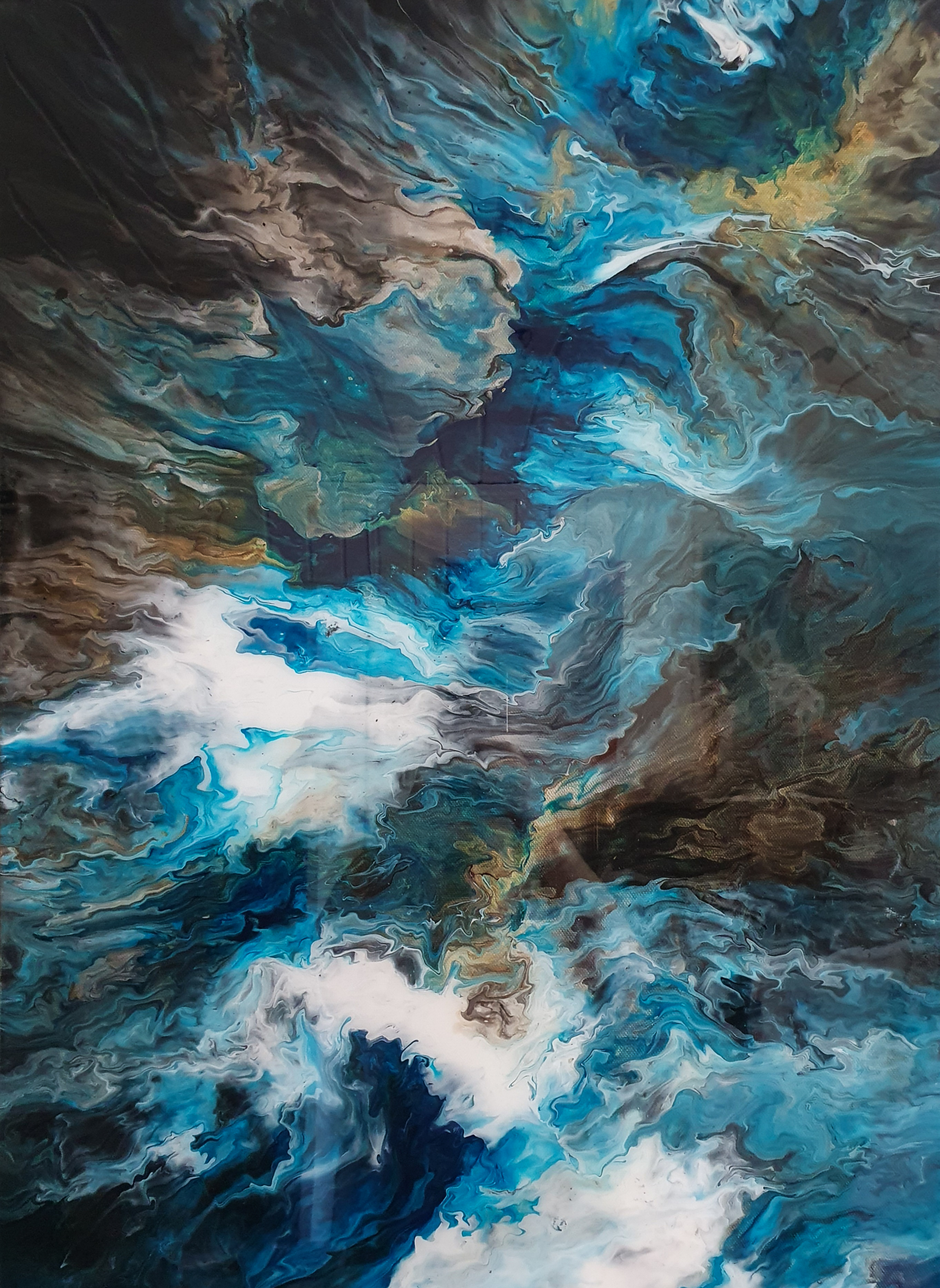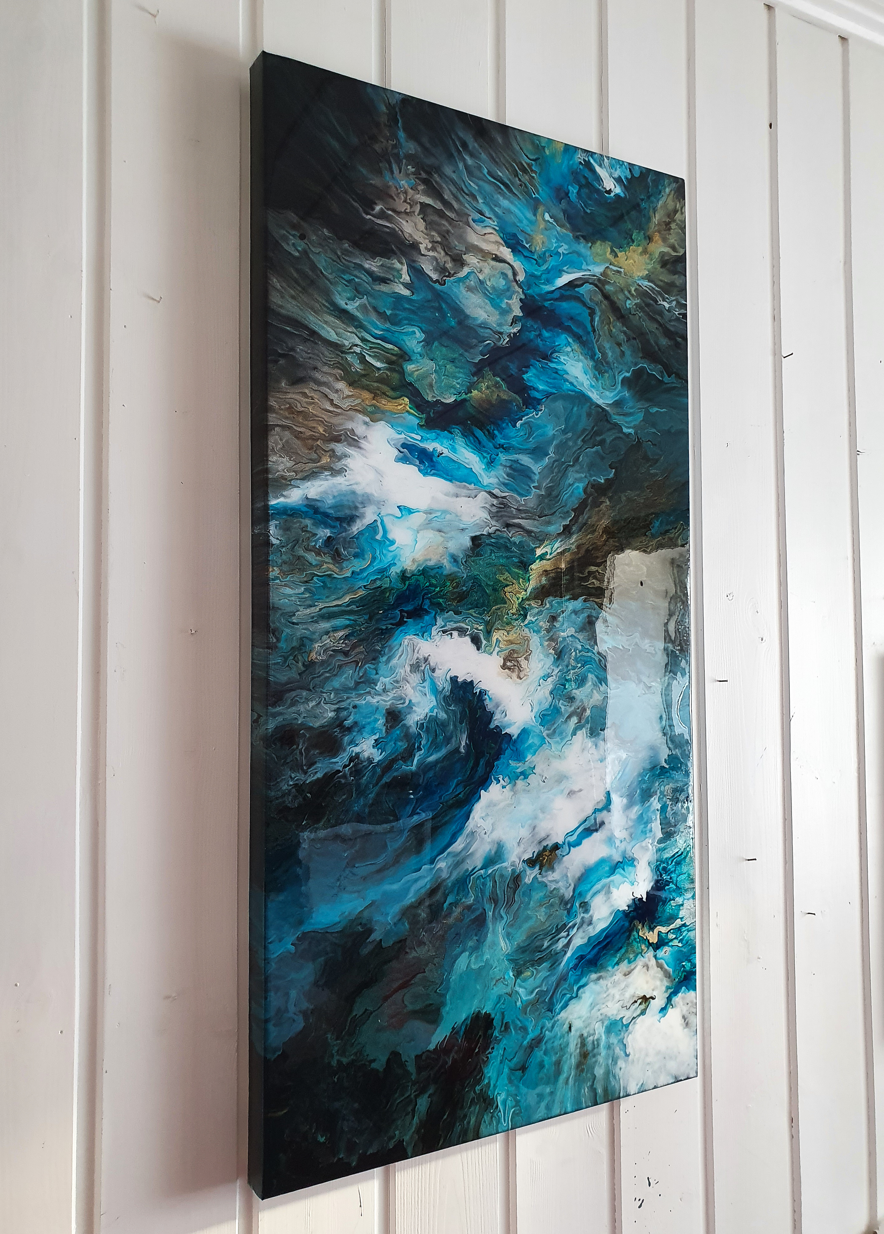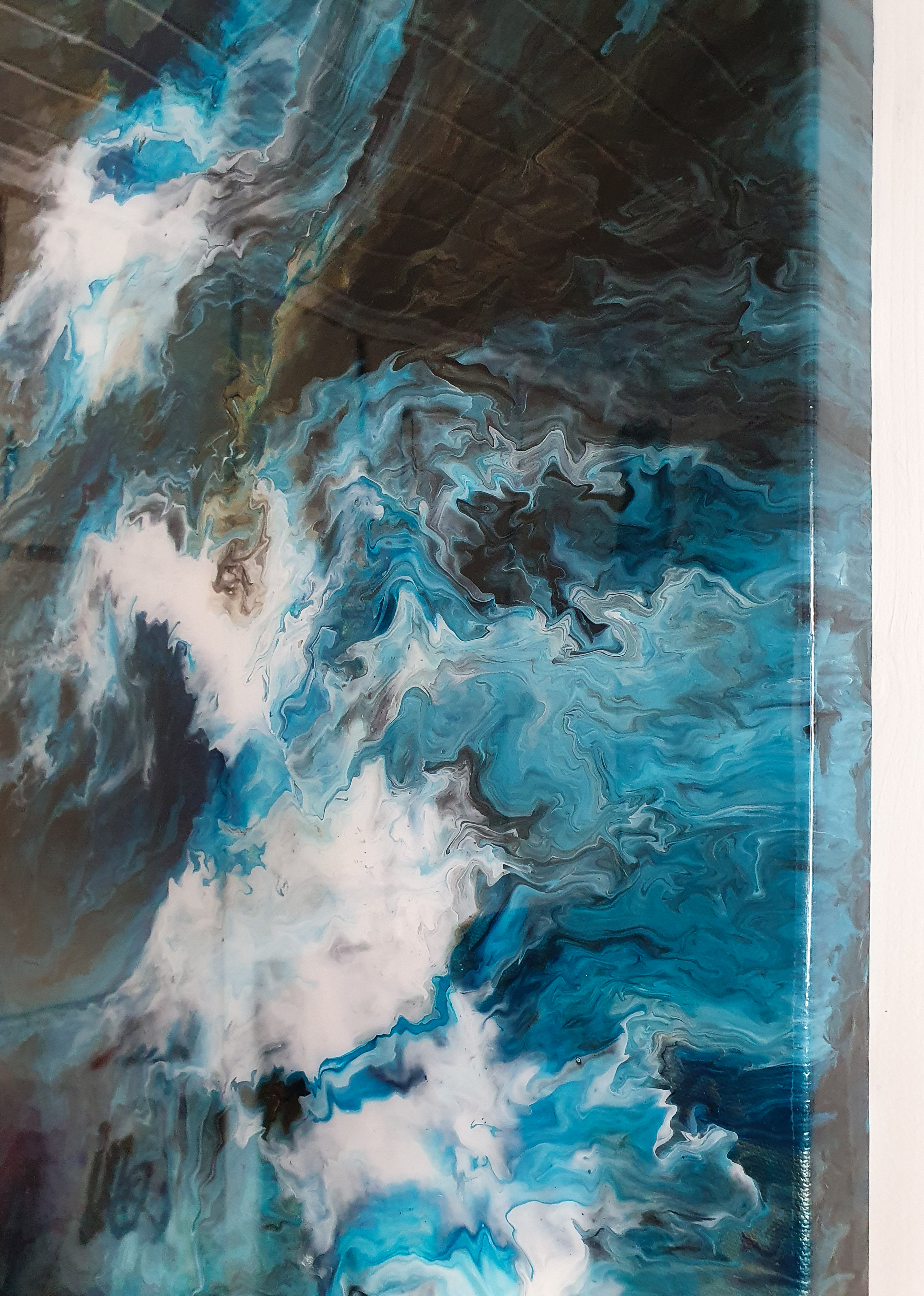 This artwork is made with acrylics and glitter/shimmer on canvas.