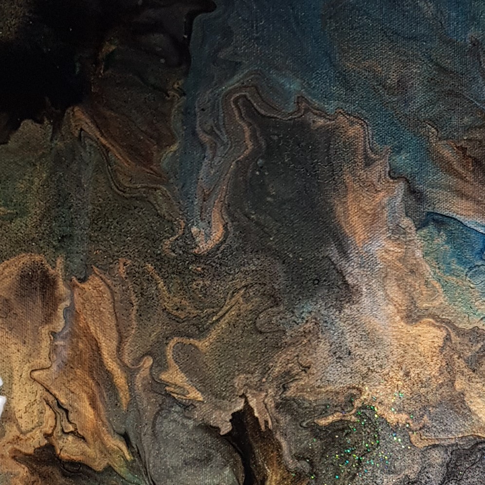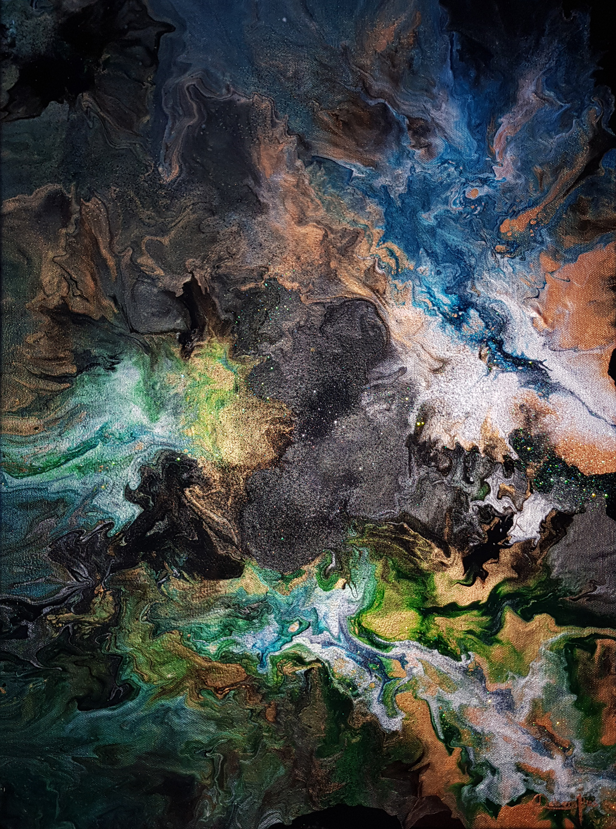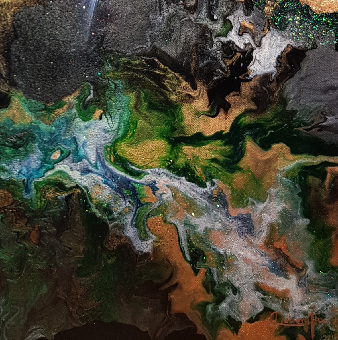 This artwork is made with acrylics and glitter/shimmer on canvas.