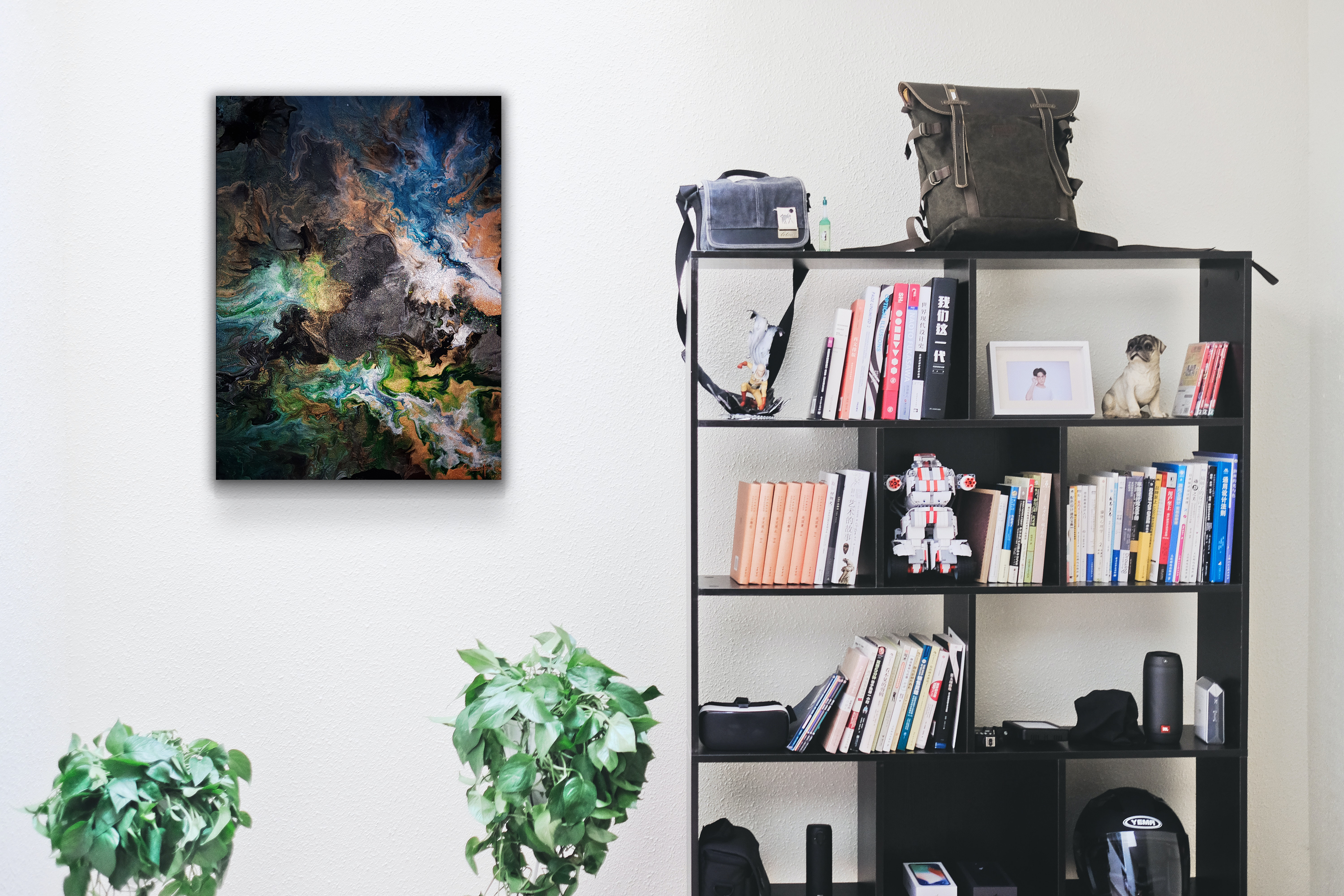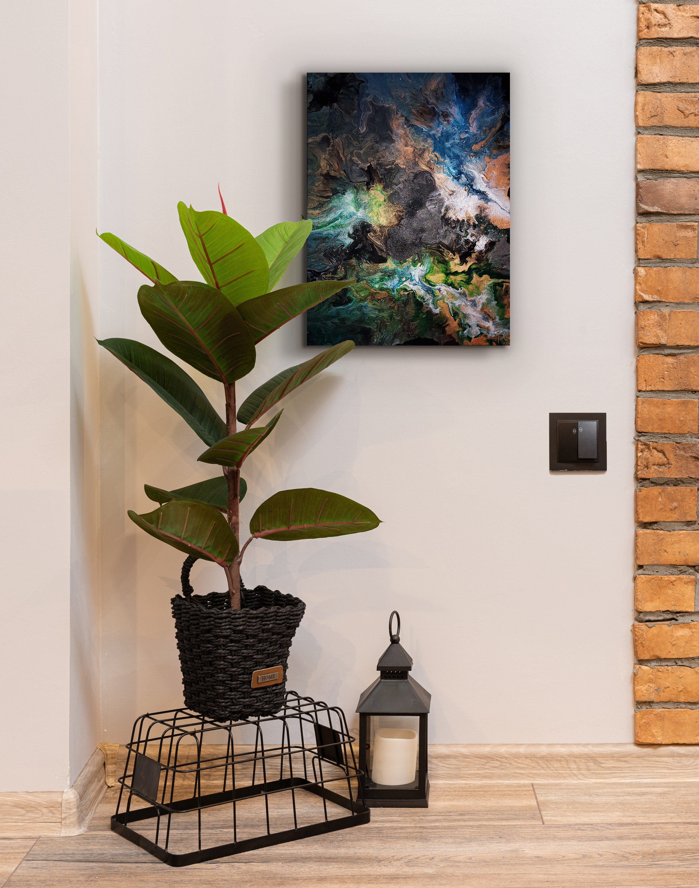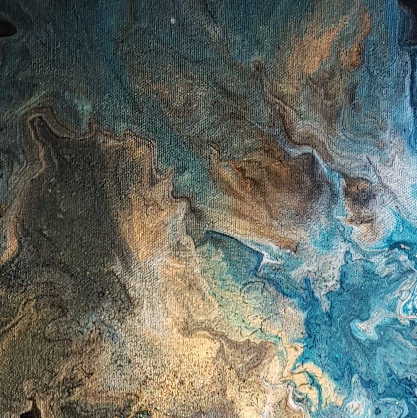 This artwork is made with acrylics and glitter/shimmer on canvas.
