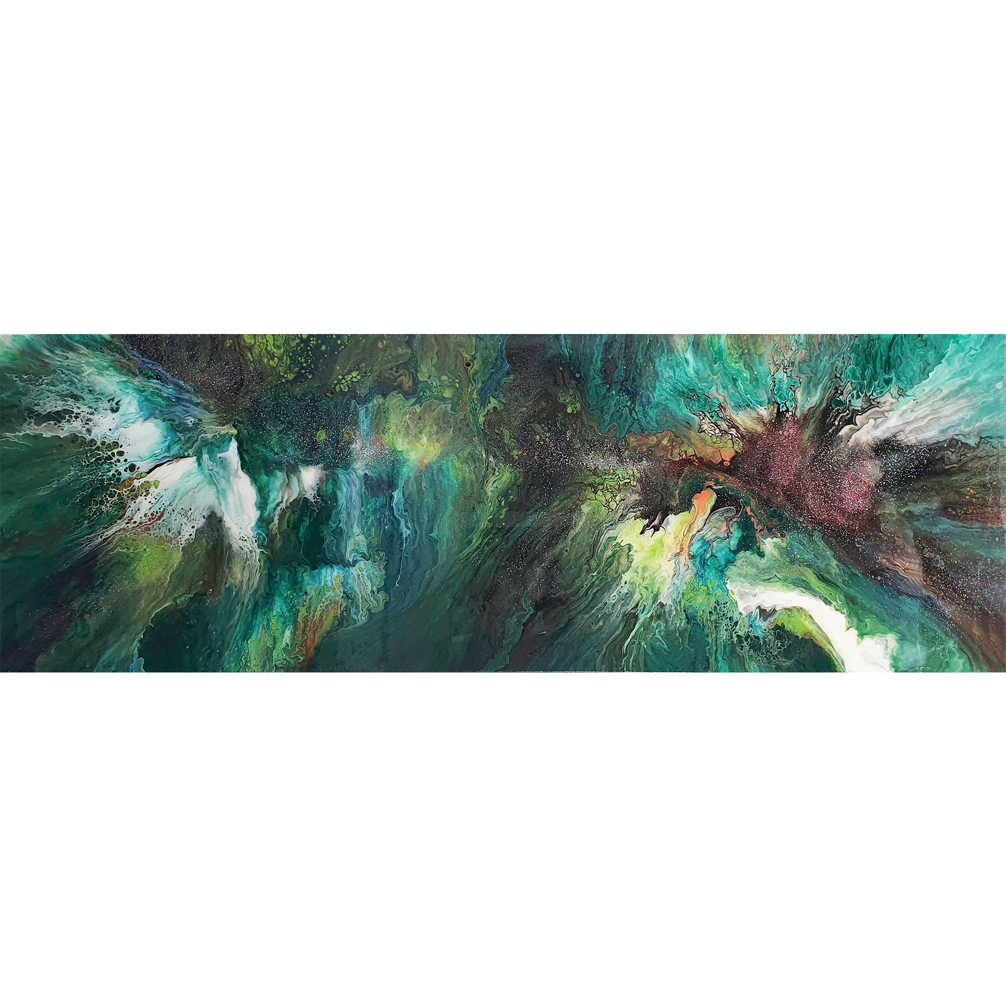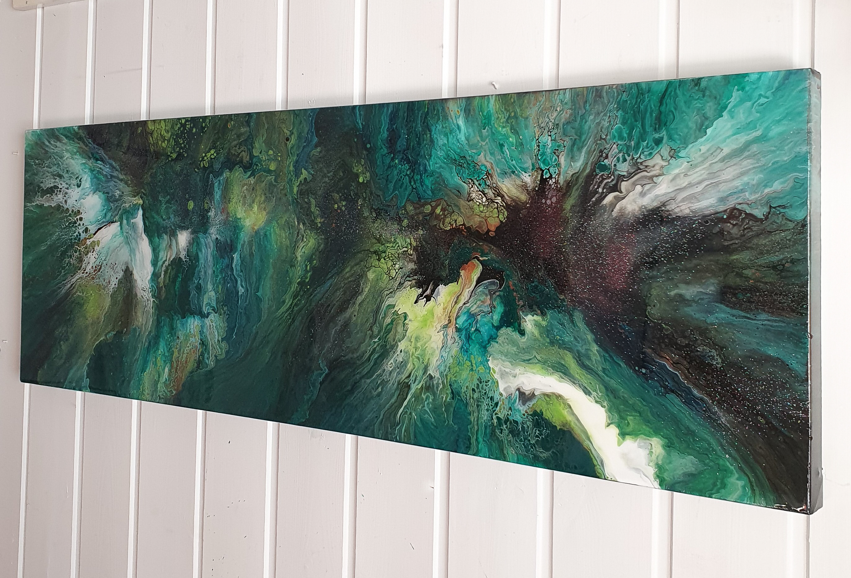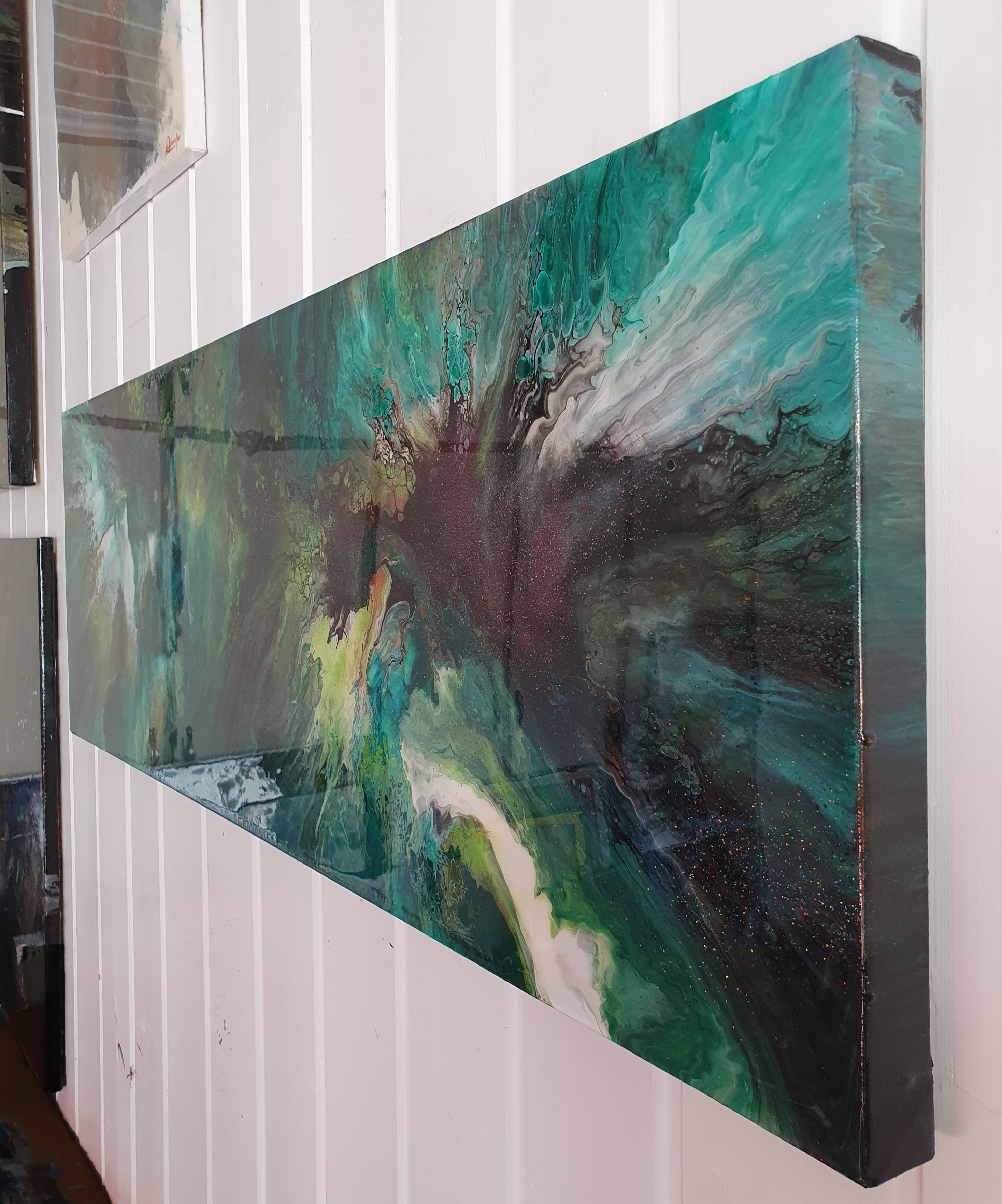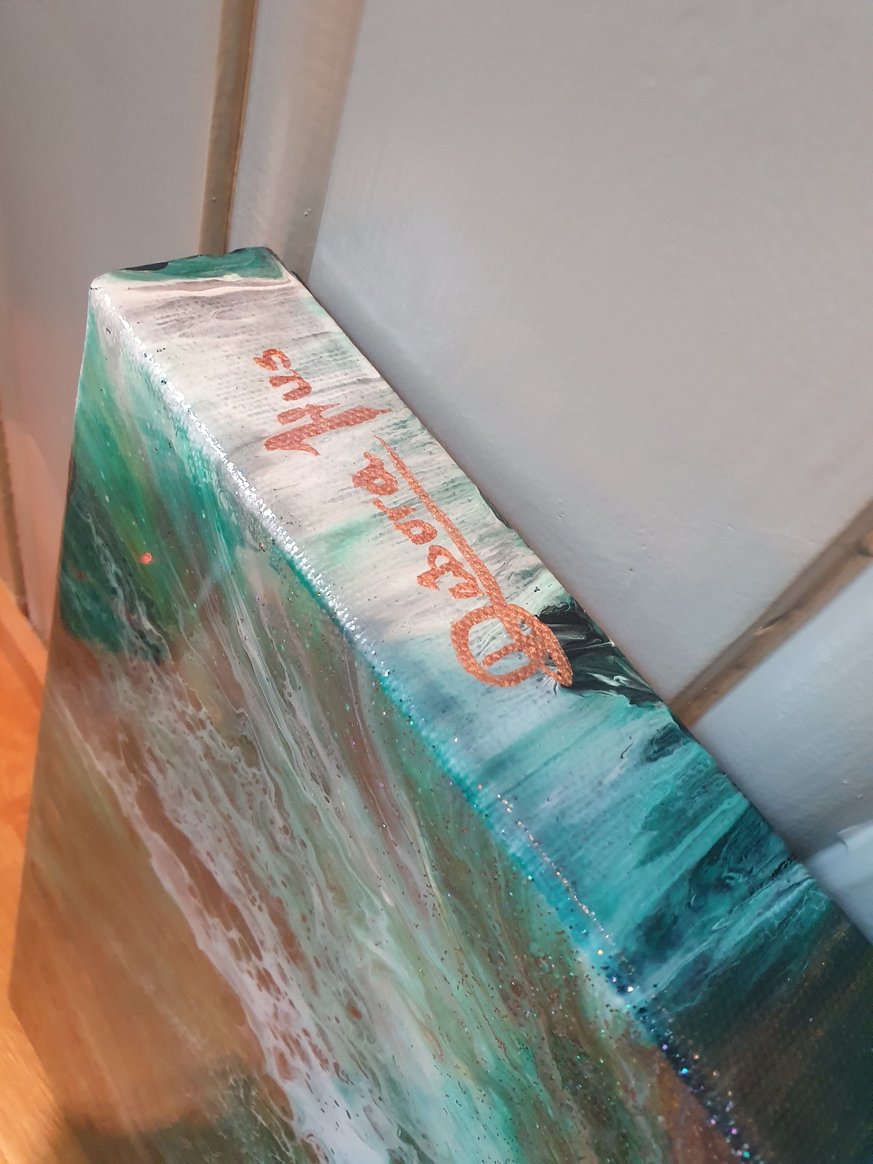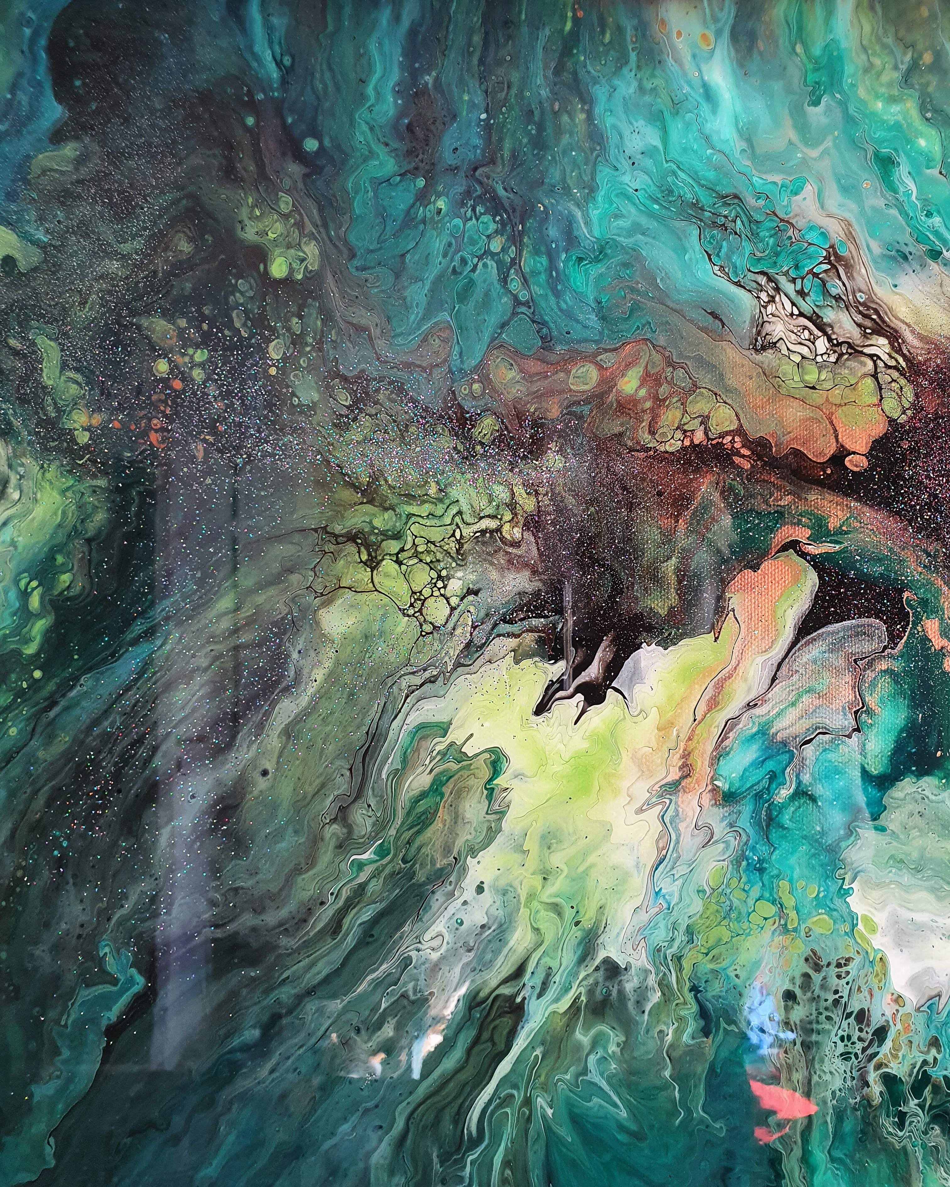Acrylic paint, glitter, and shimmer are used to create this piece of art on canvas.