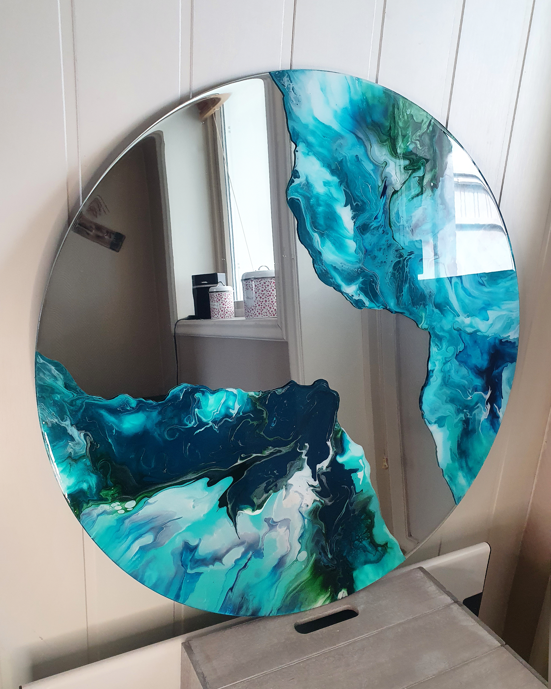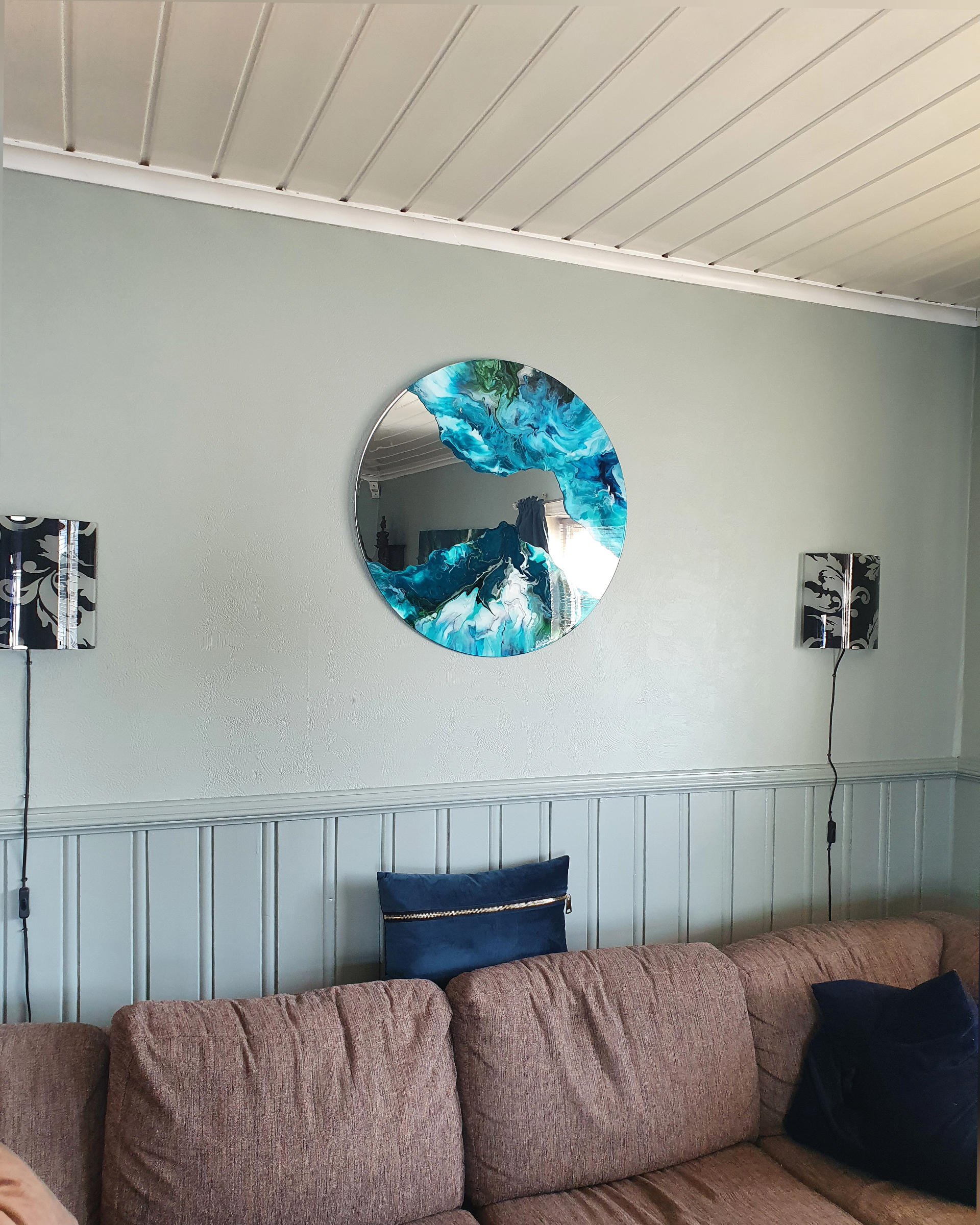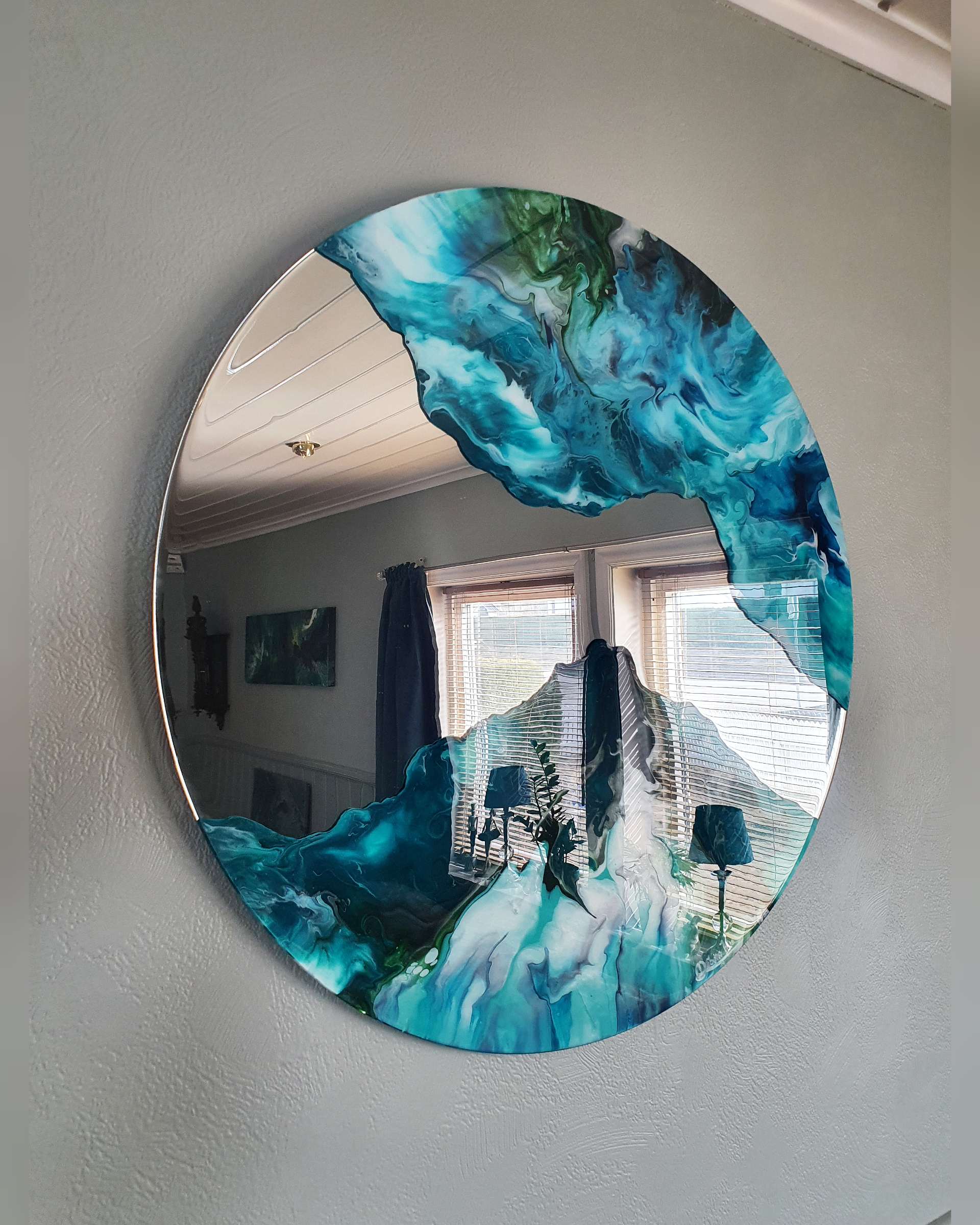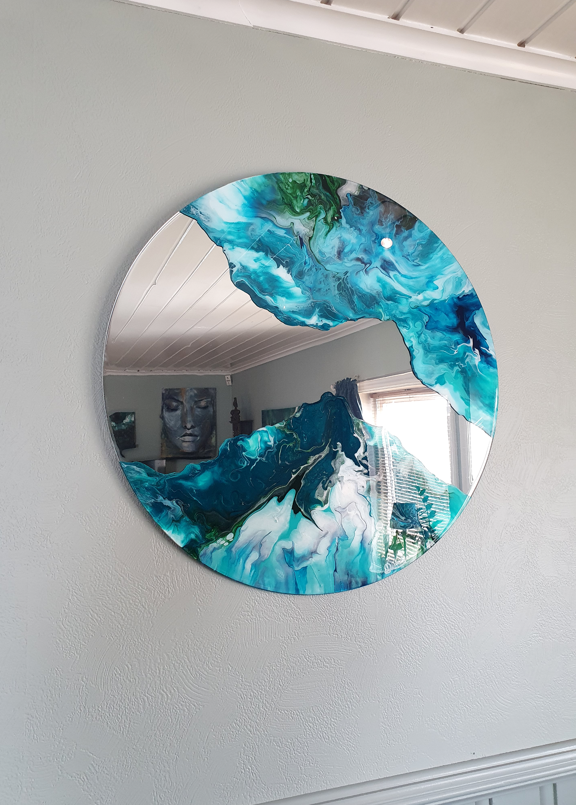This artwork is made with acrylics on a mirror.