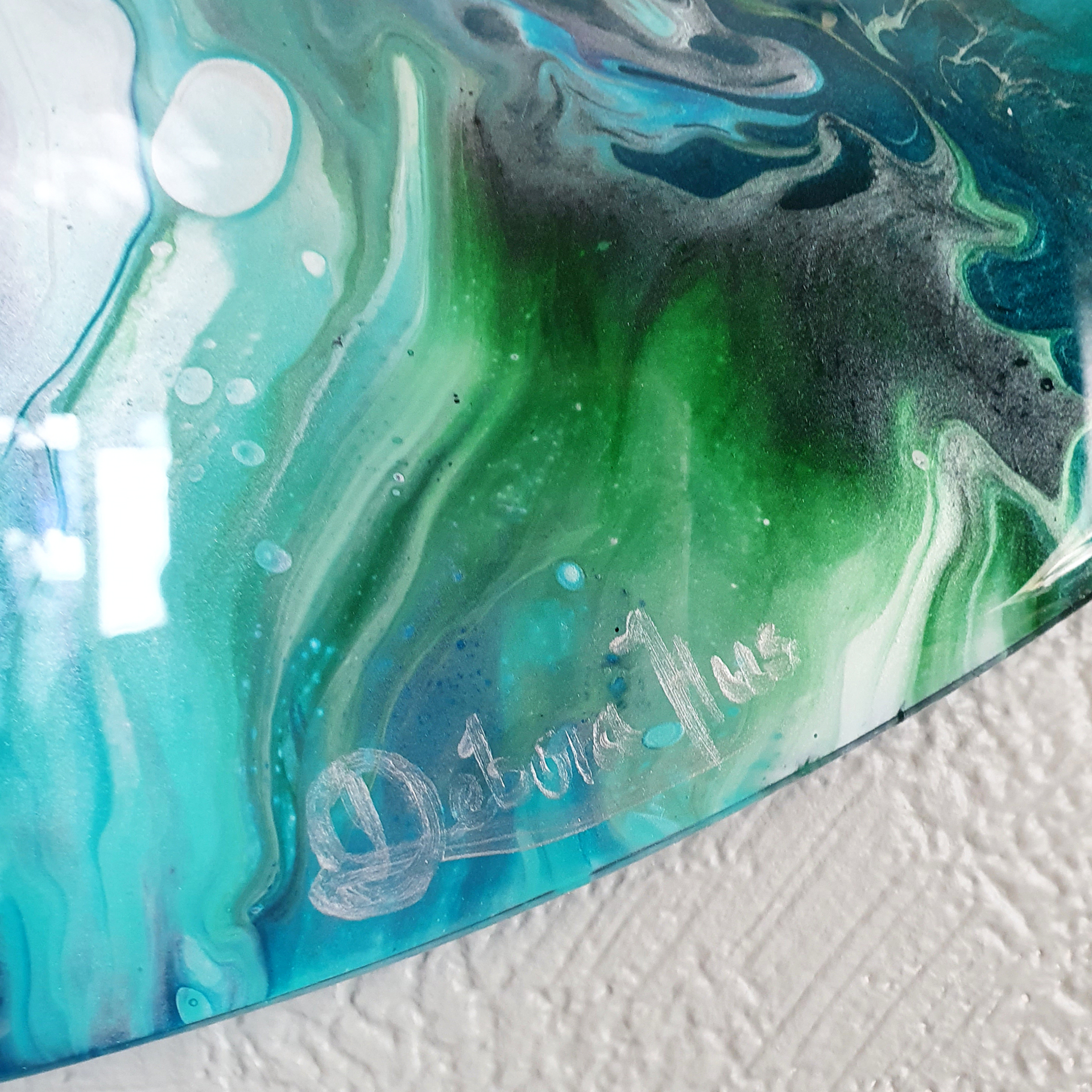 It has a layer of epoxy resin that has a similar effect to glass that gives a shiny effect.