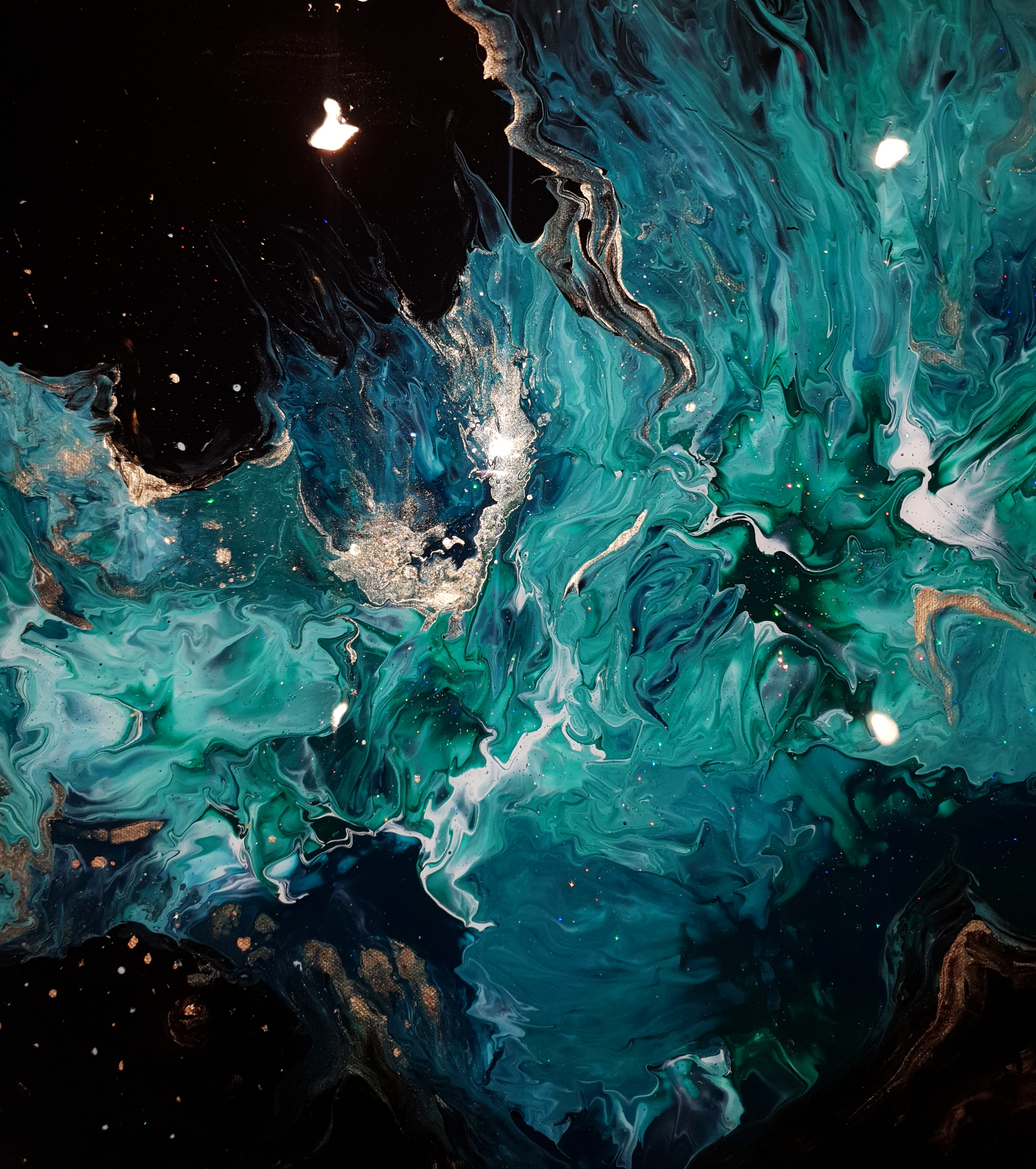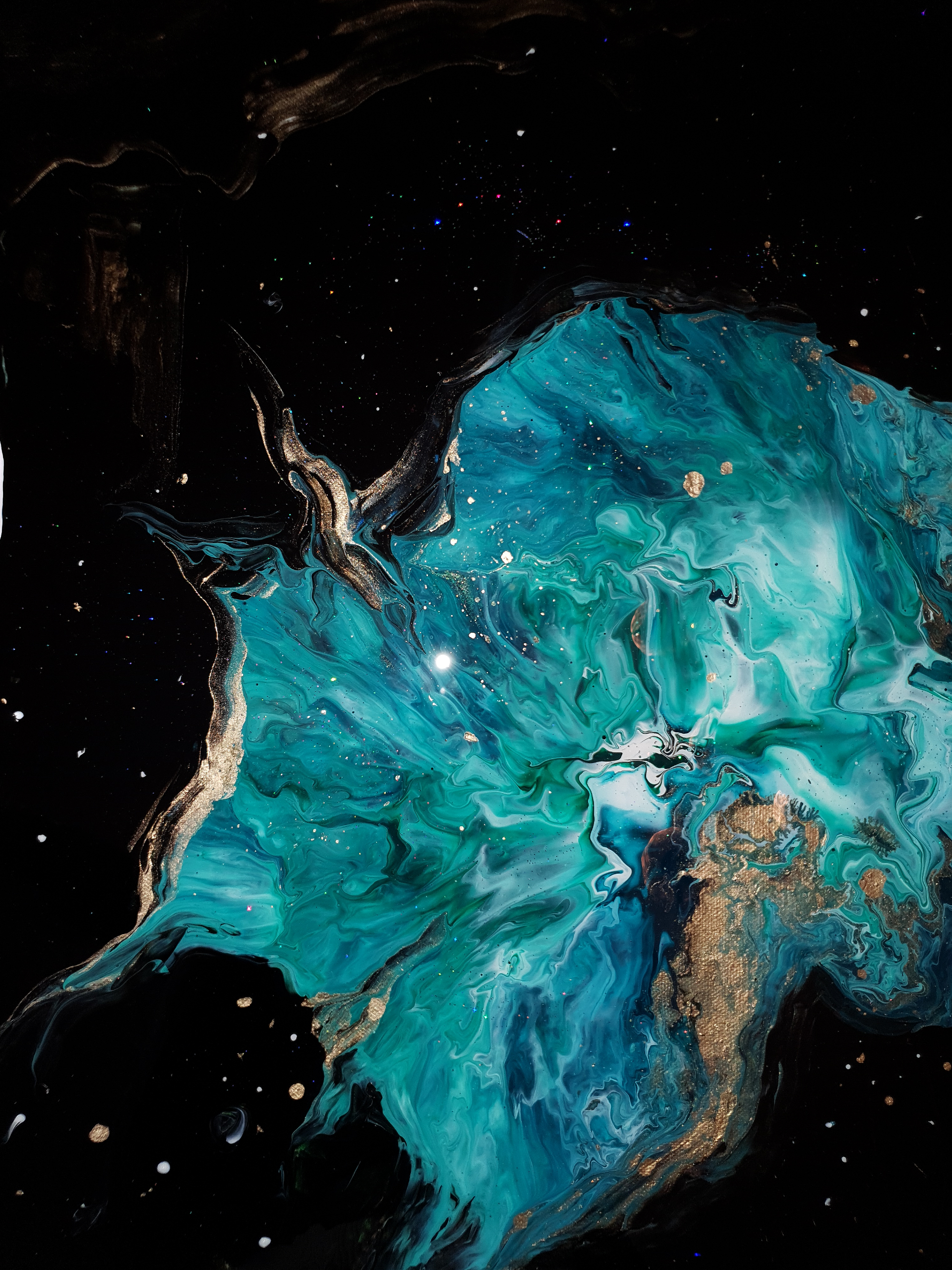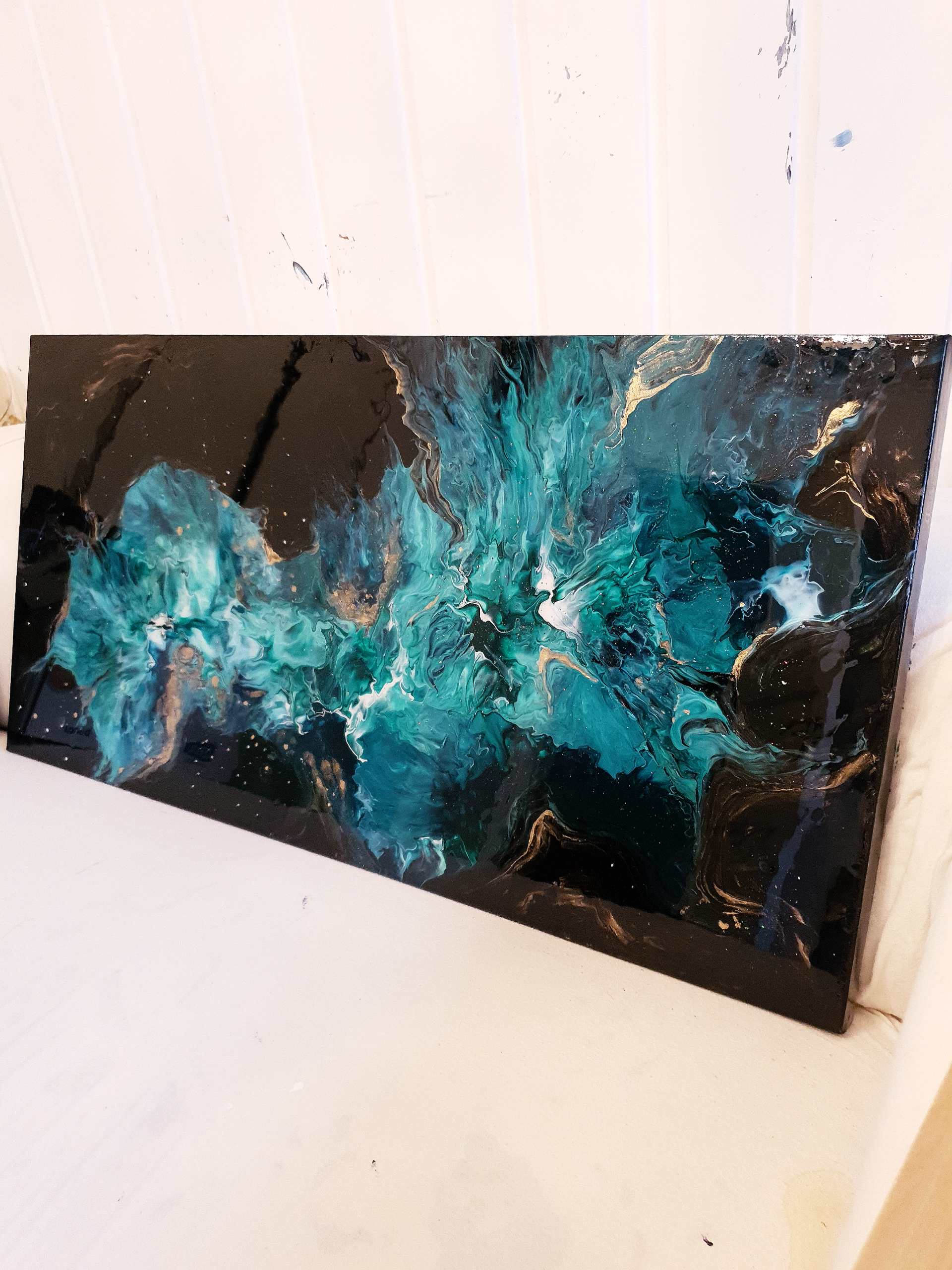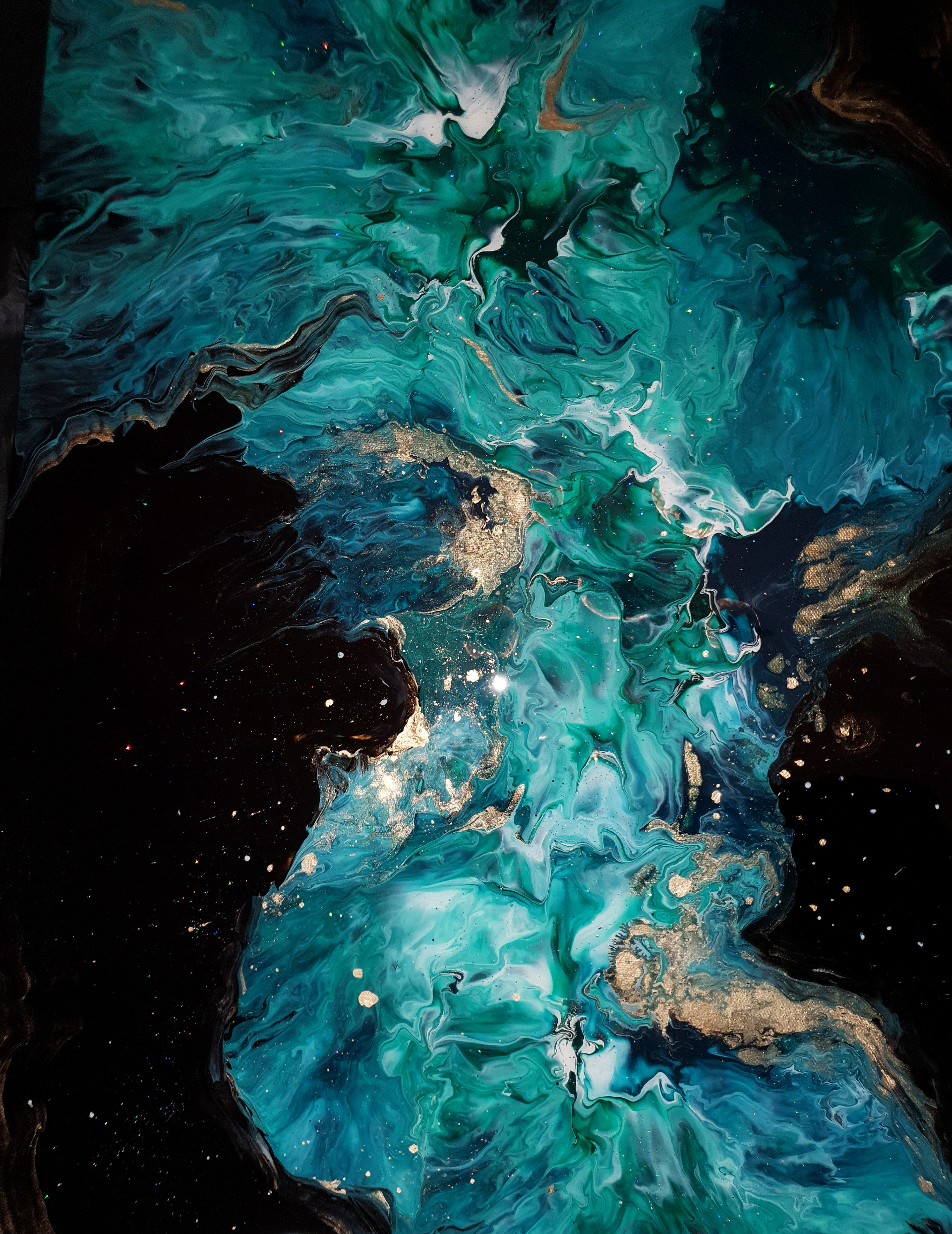 This artwork is made with acrylics paint and shimmer/glitter on canvas.