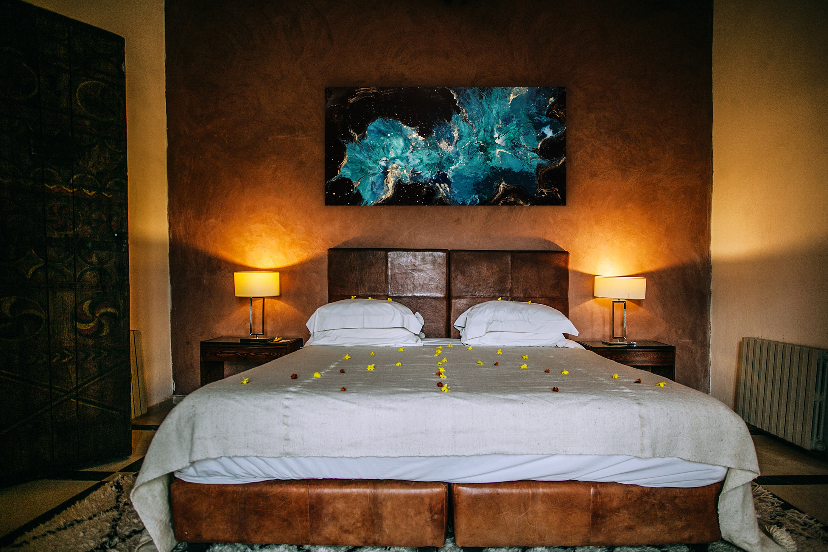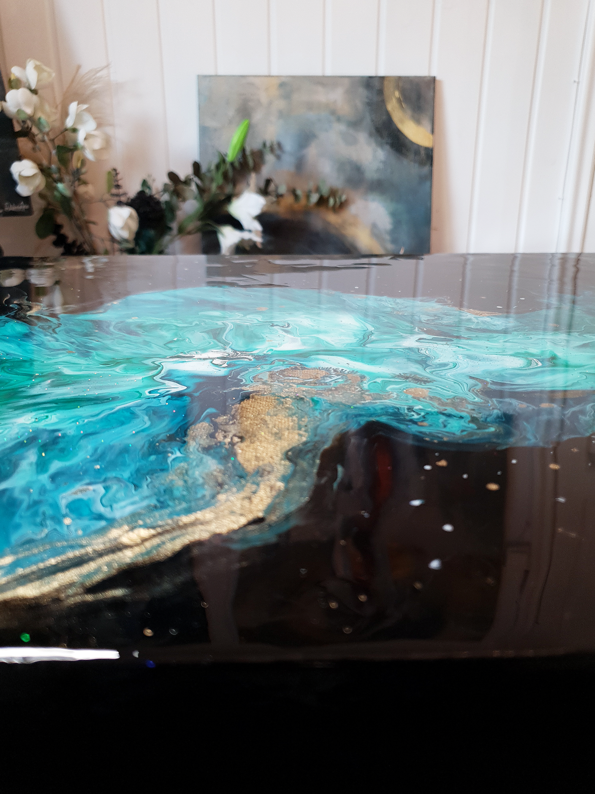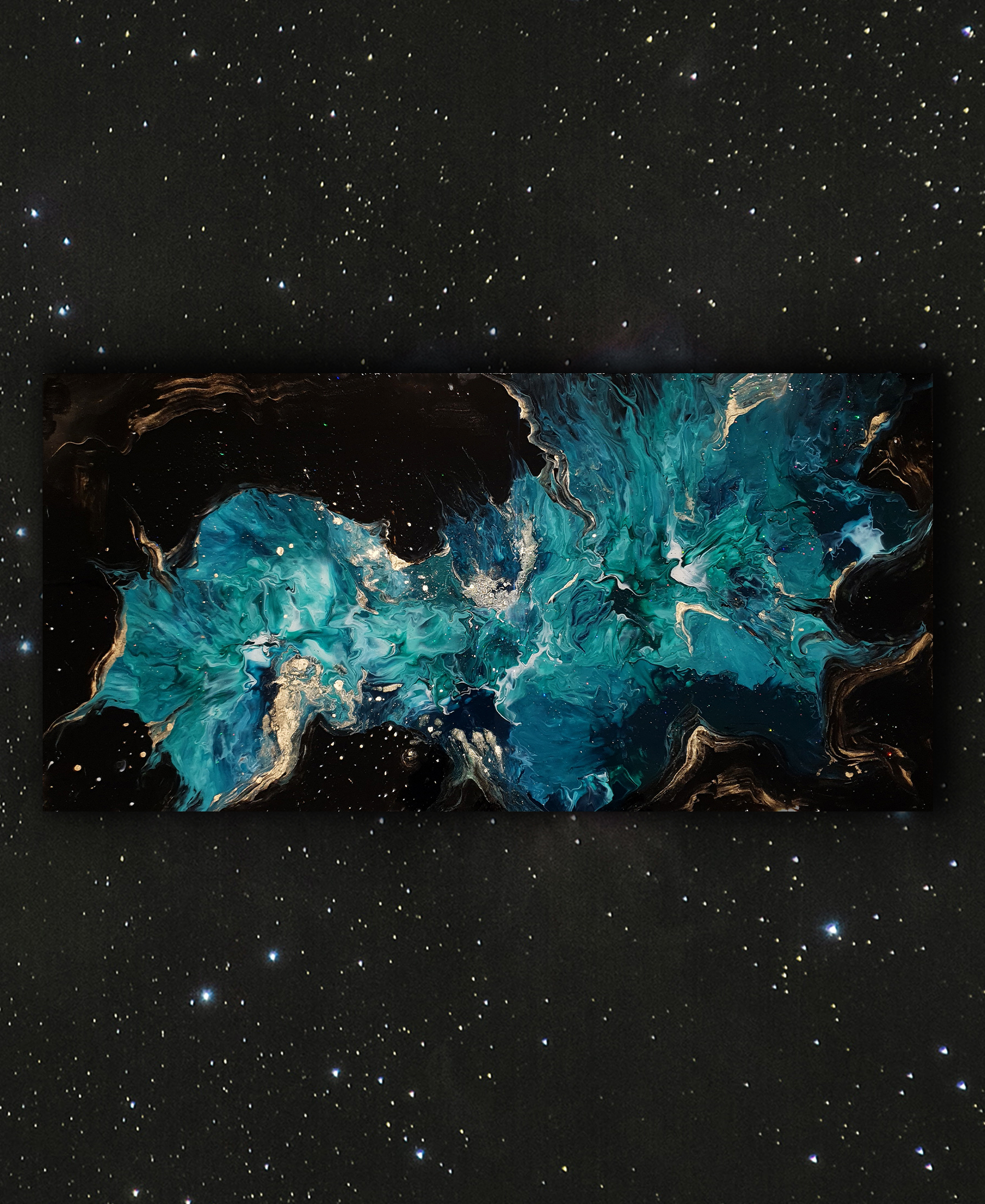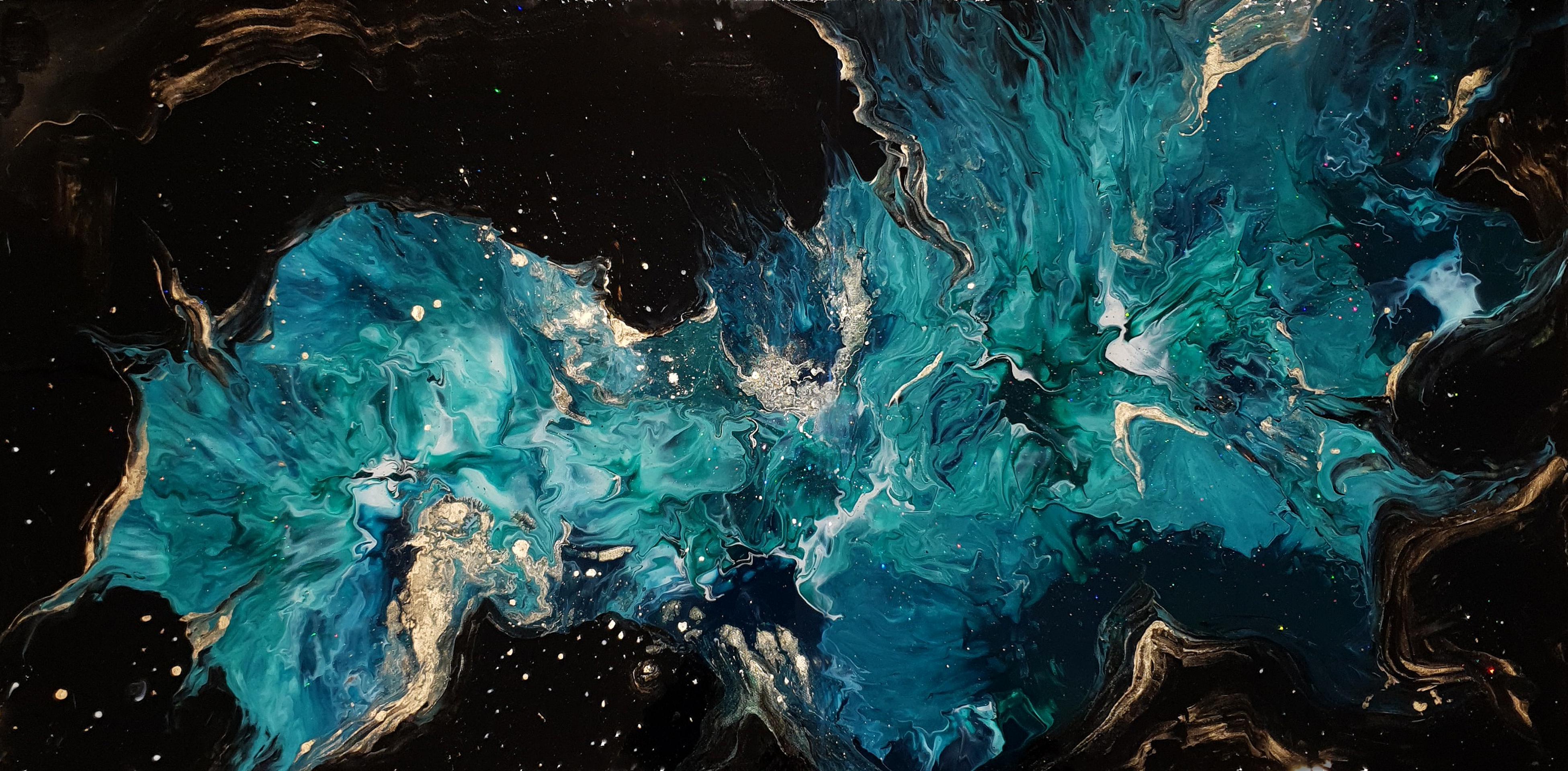 This artwork is made with acrylics paint and shimmer/glitter on canvas.