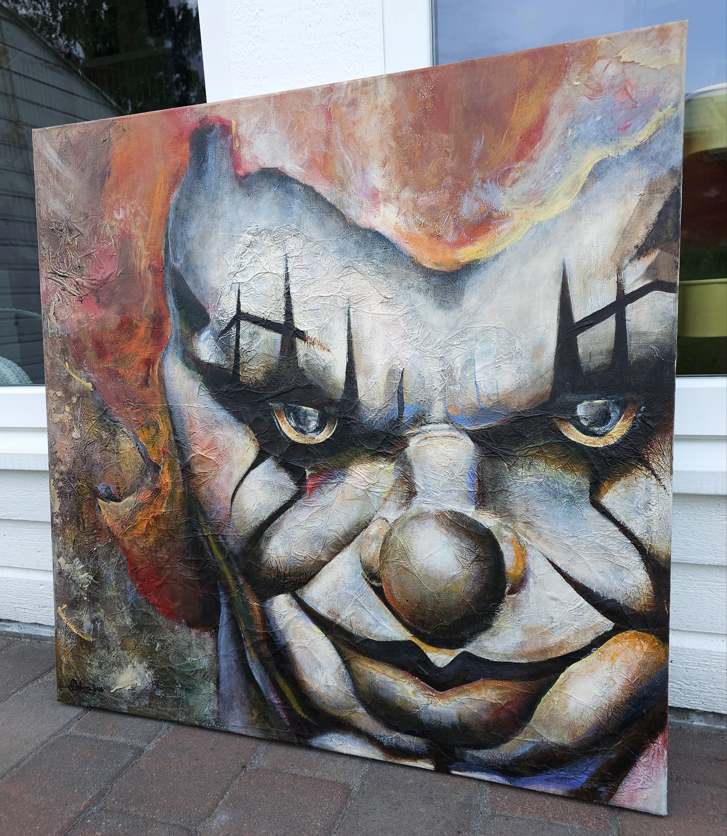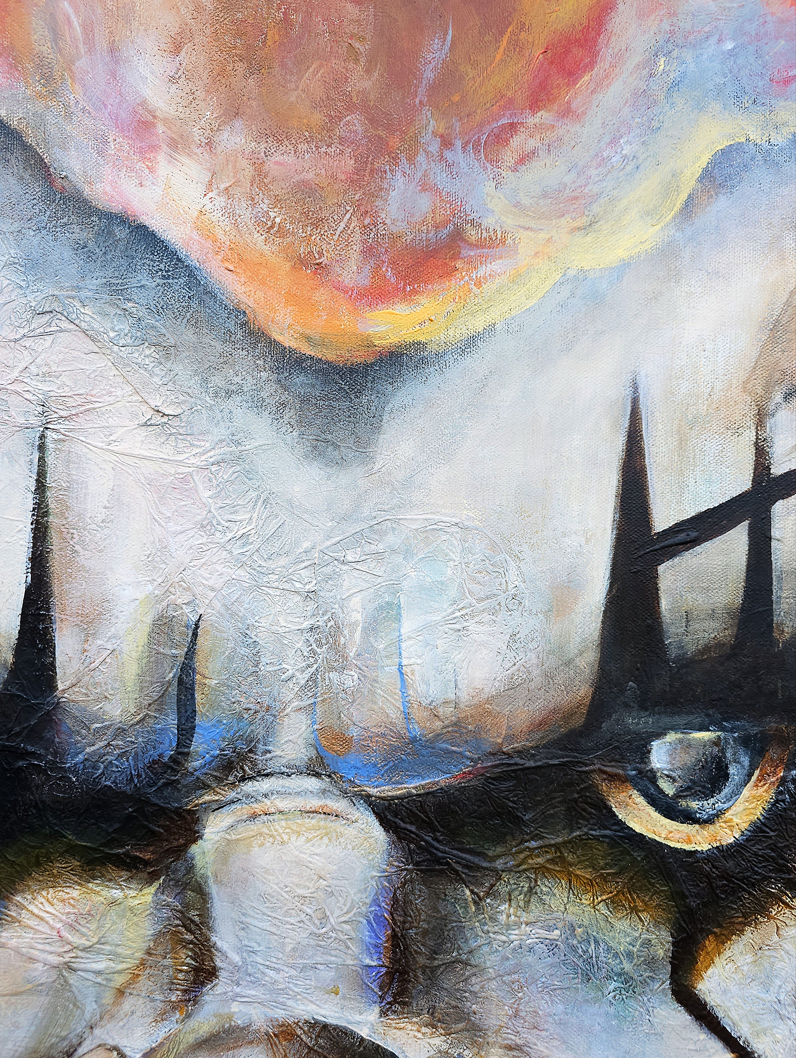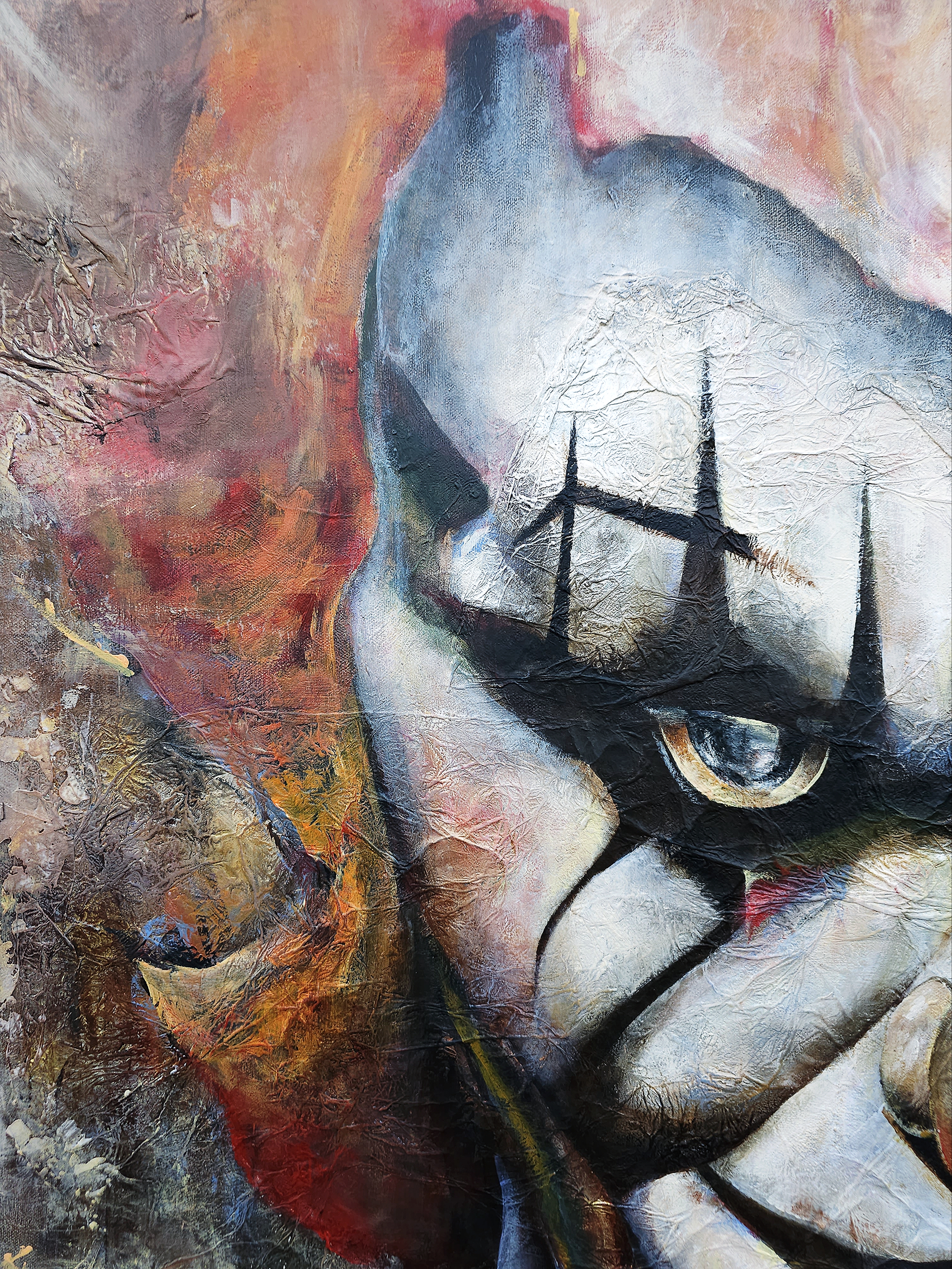 This artwork is made with acrylic paint, aluminum foil, modelling paste, and transparent gloss varnish on a stretched canvas.