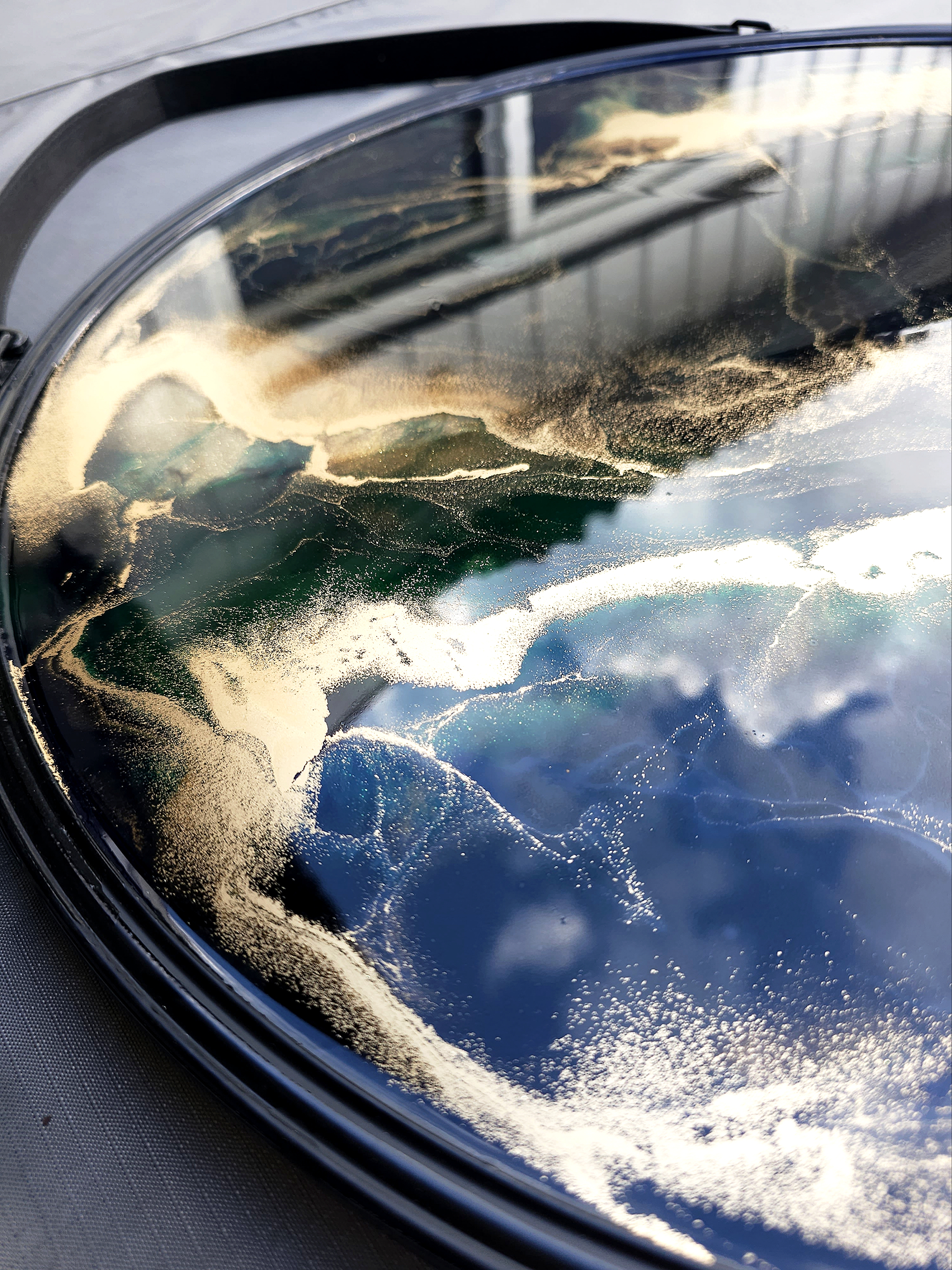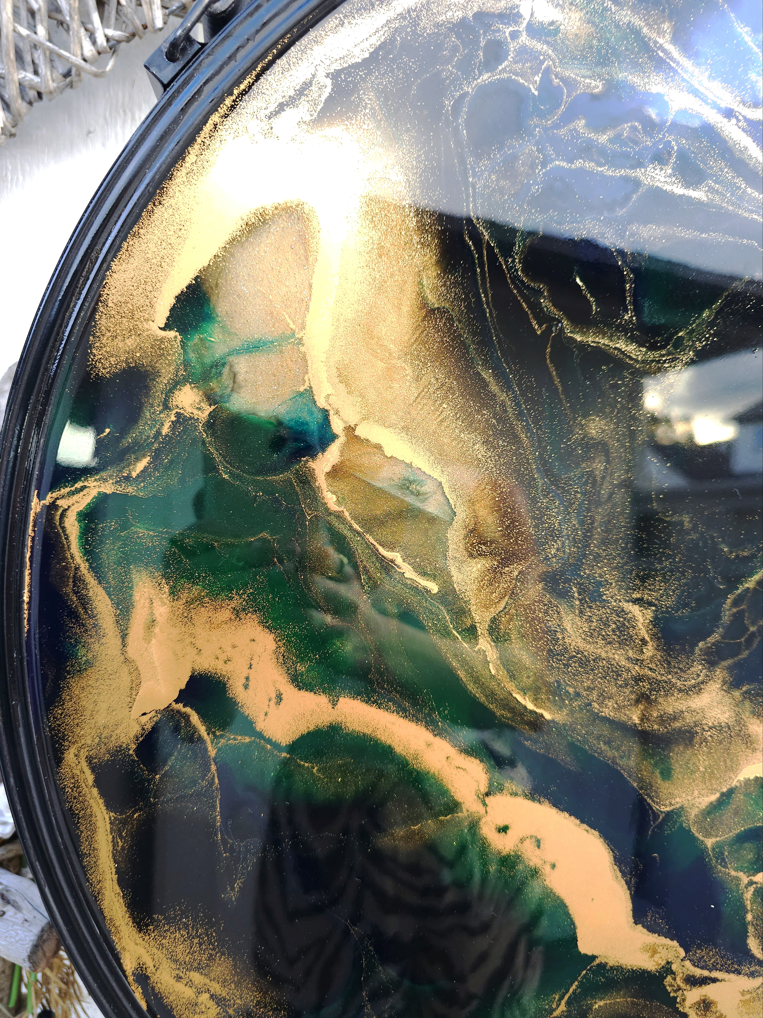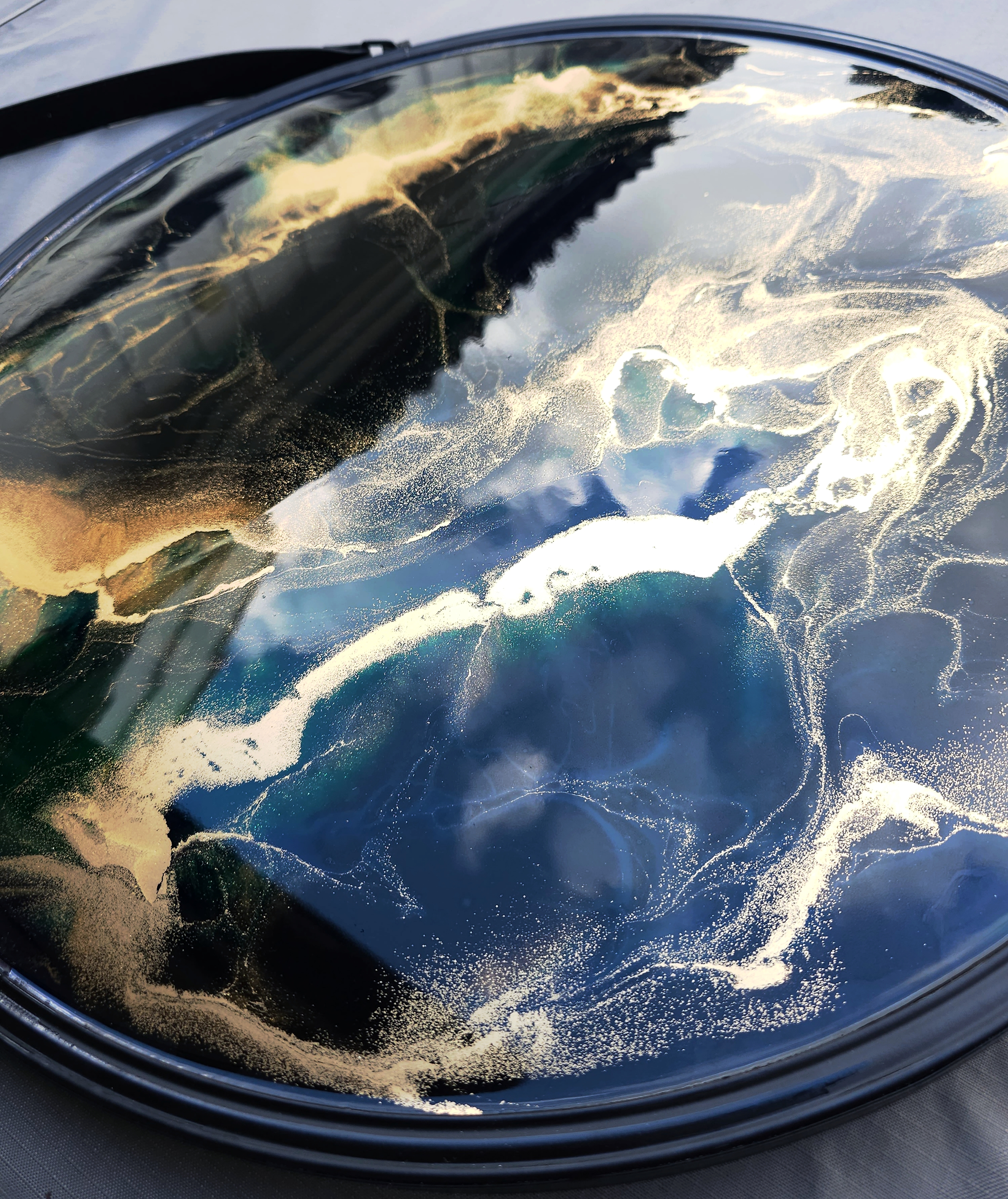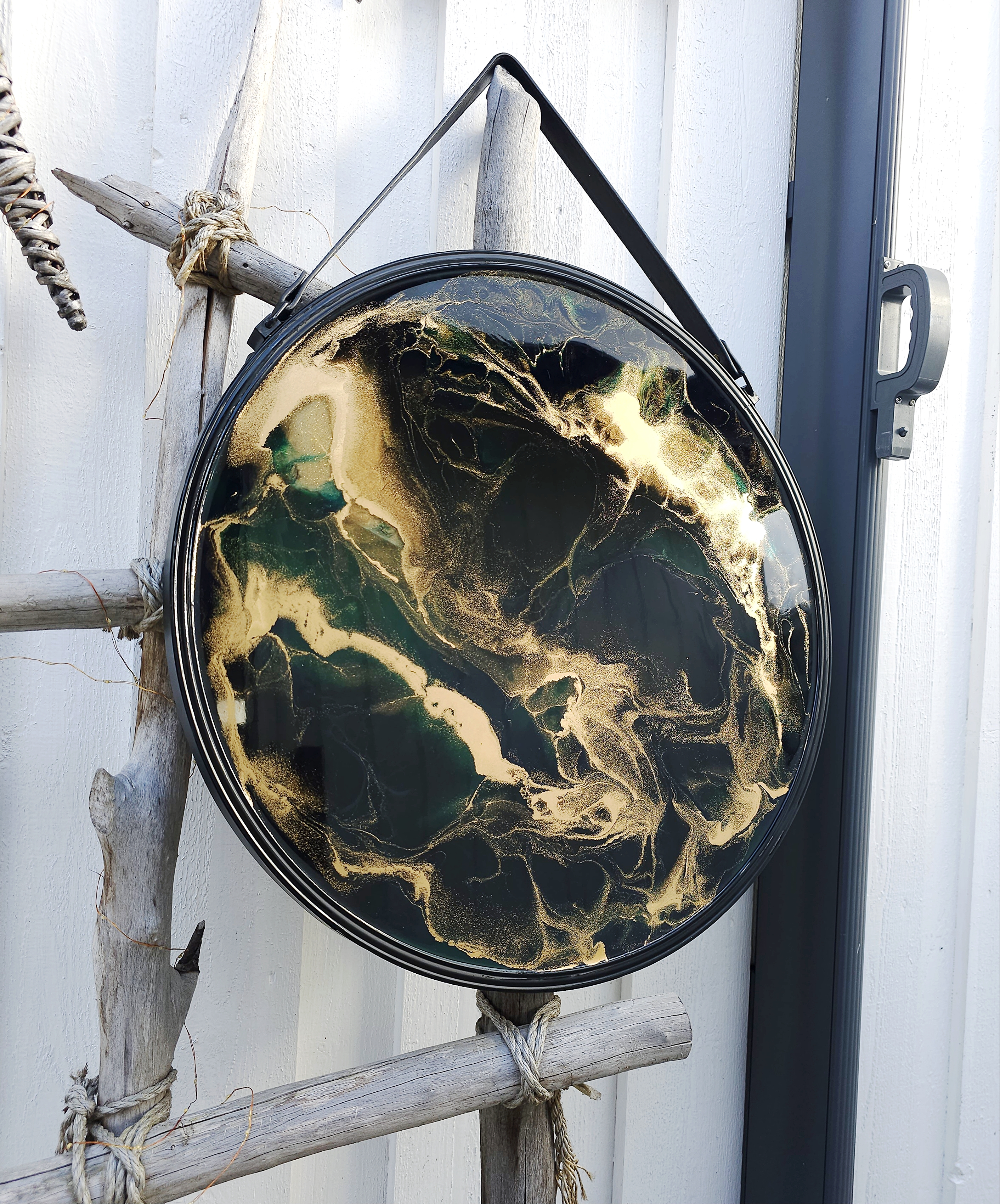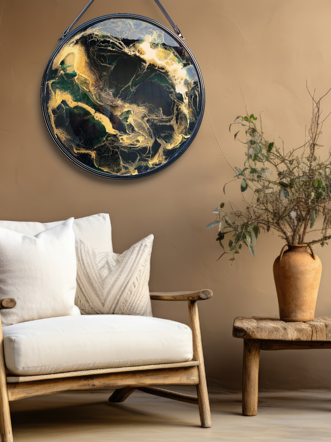 This painting was created on a circular cardboard bottom using epoxy resin, epoxy colour pigments, and metallic pigment powder. The epoxy resin gives the art piece a glass-like appearance. The artwork is signed with a marker on the back. The frame is incorporated within the artwork.