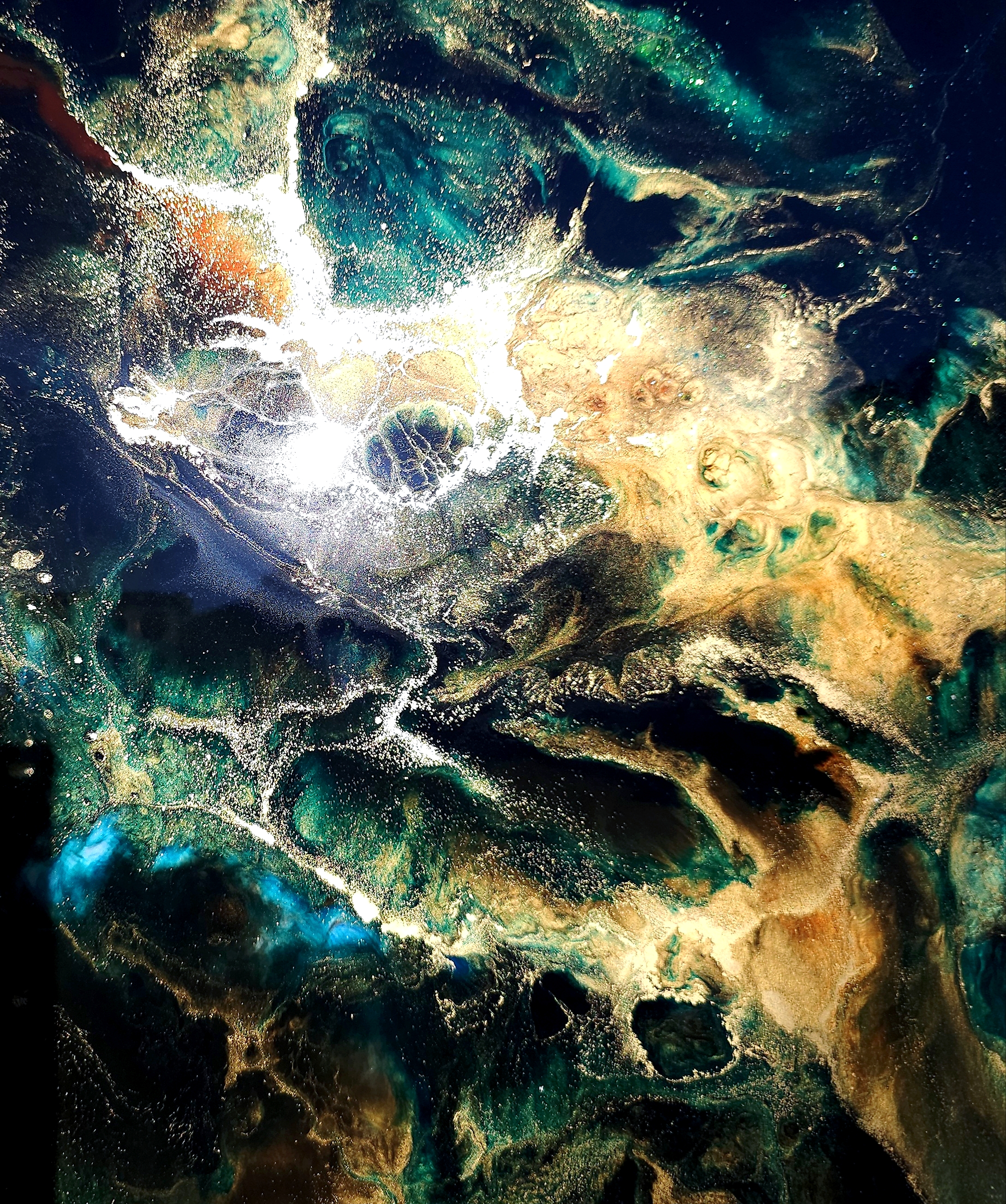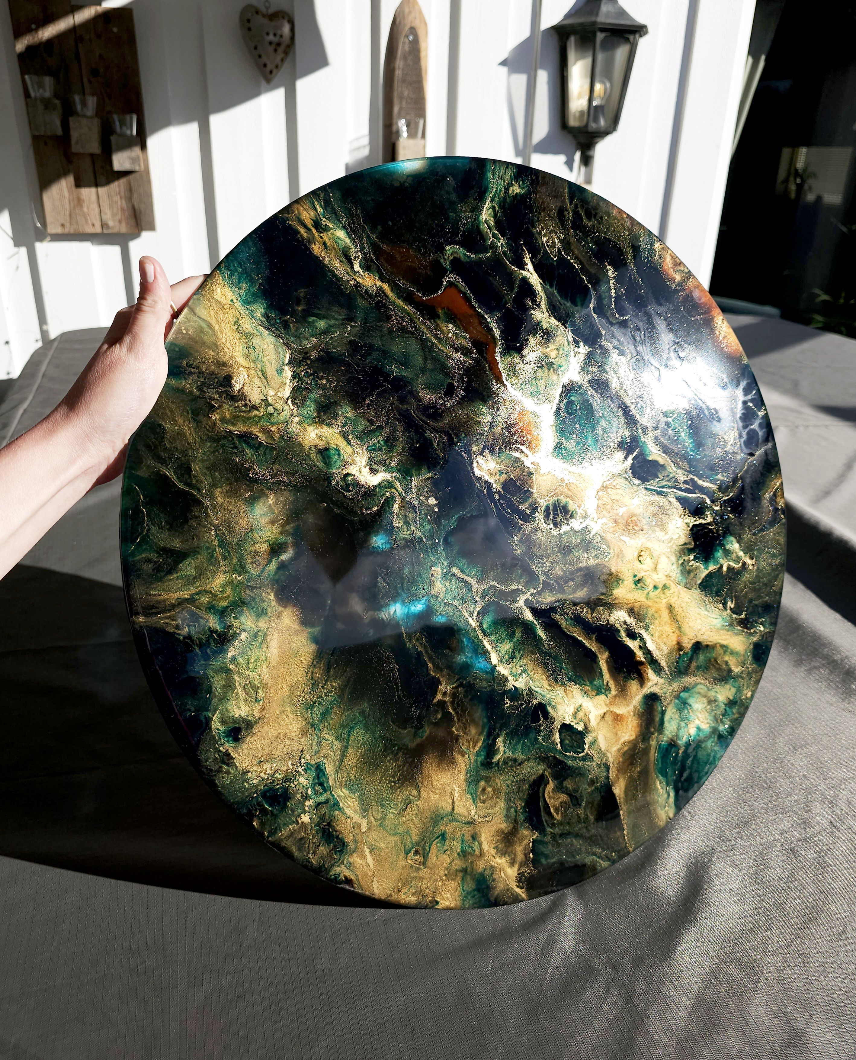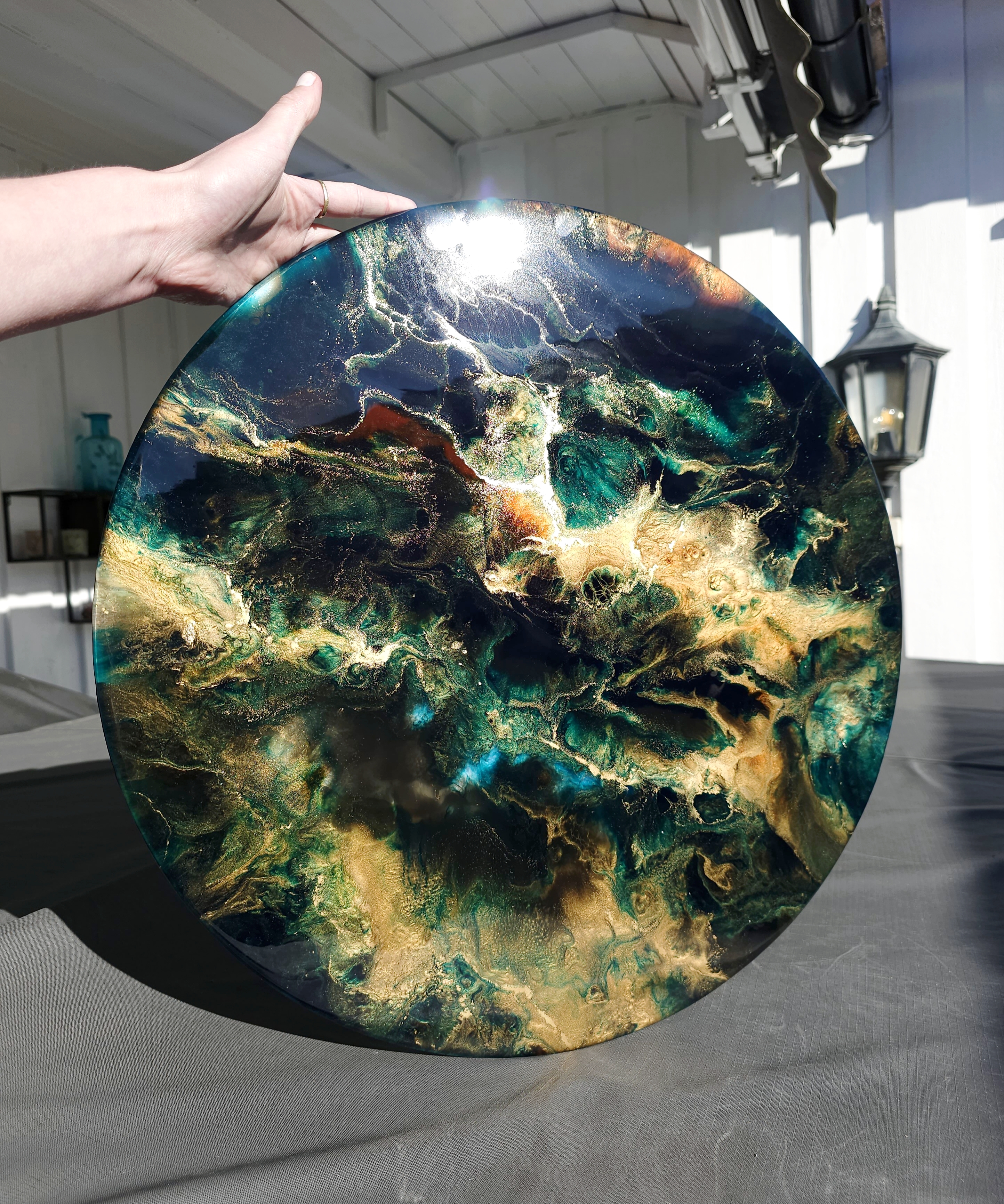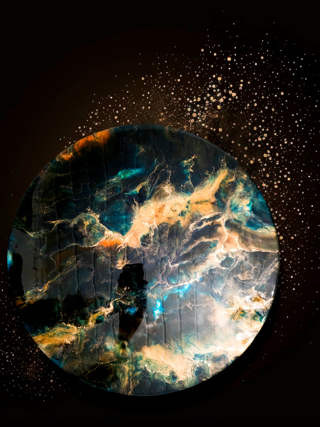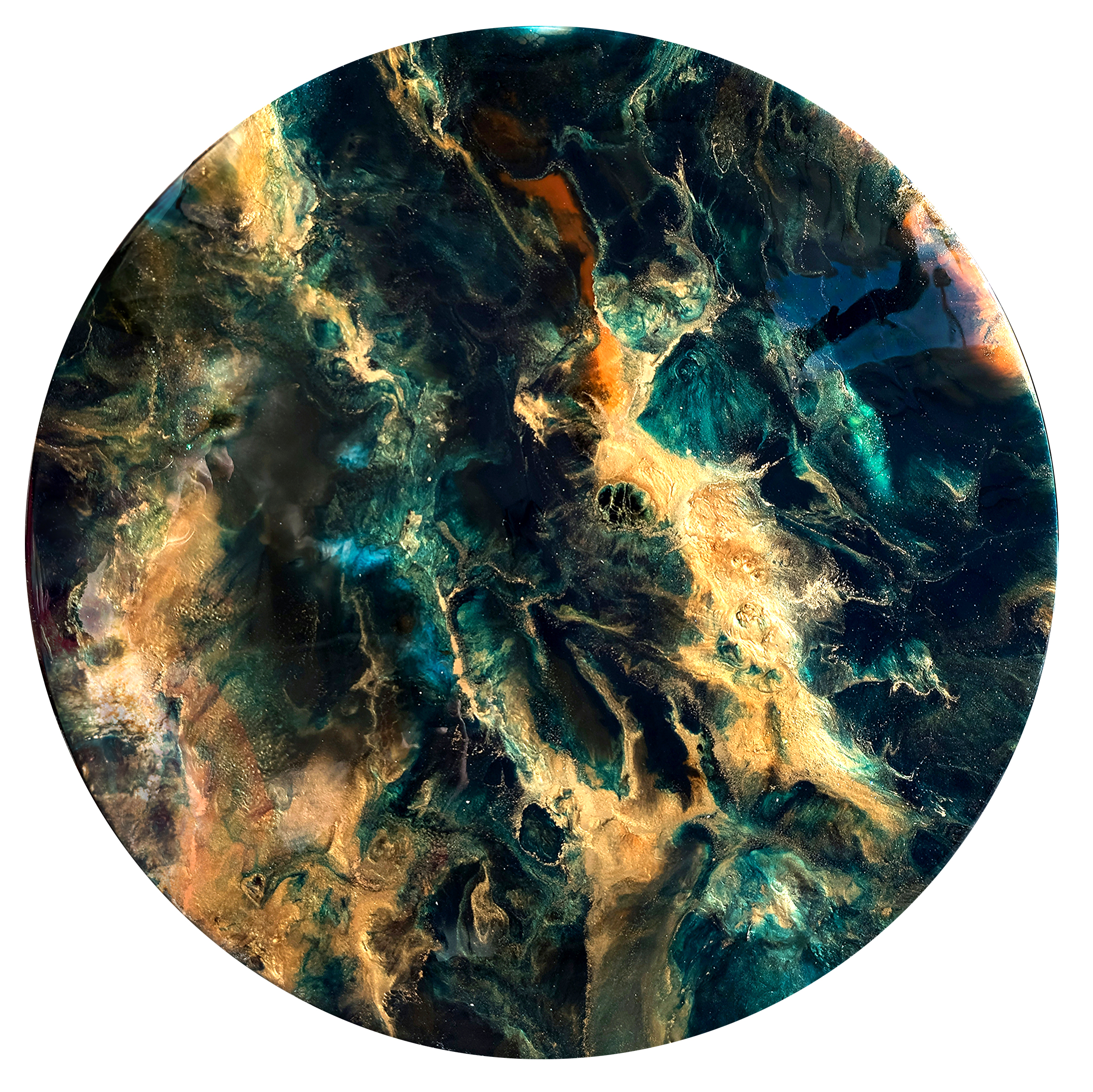 This painting was created on a circular mirror using epoxy resin, epoxy colour pigments, and metallic pigment powder. The epoxy resin gives the art piece a glass-like appearance. The artwork is signed with a marker on the back. The frame is incorporated within the artwork.