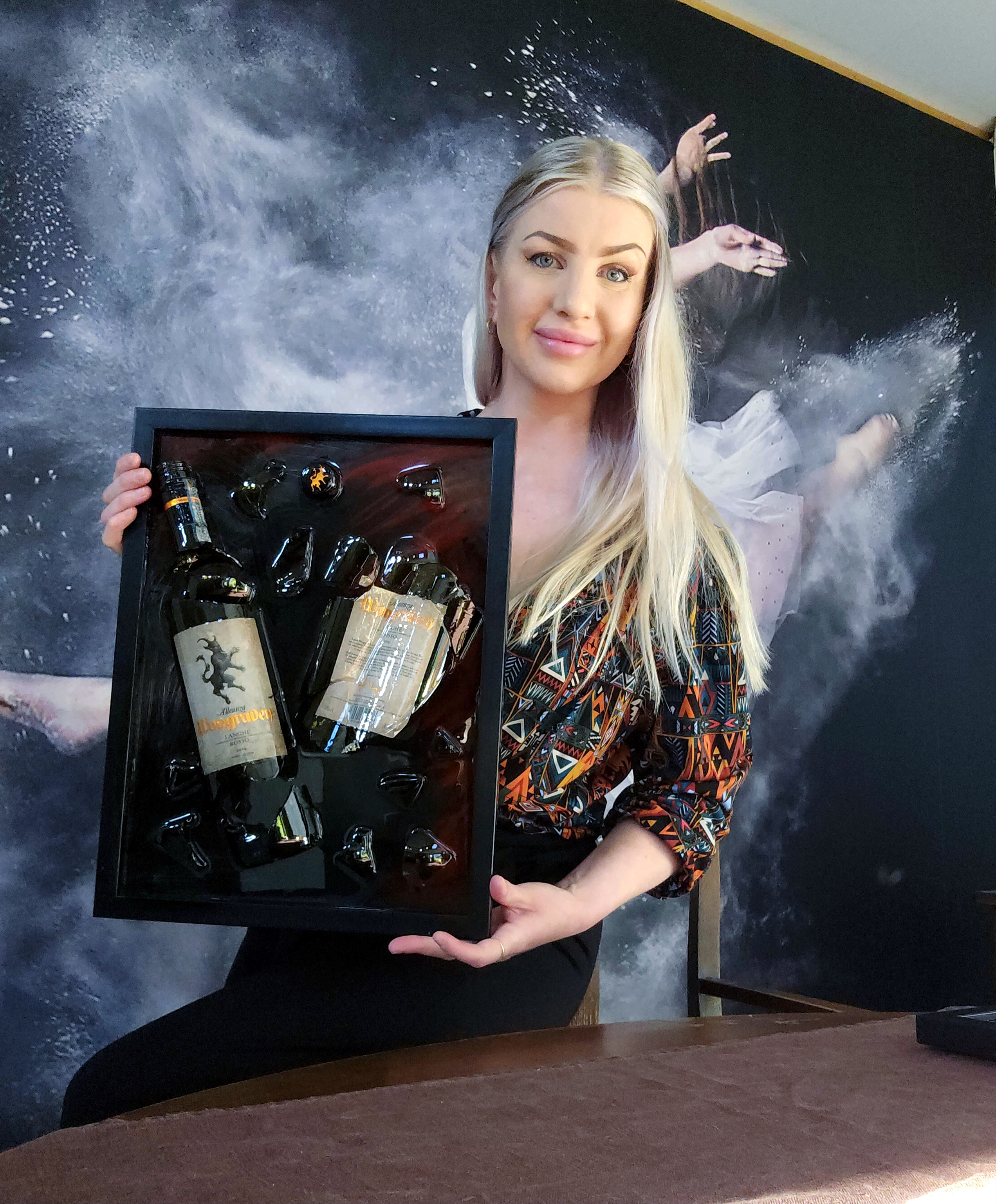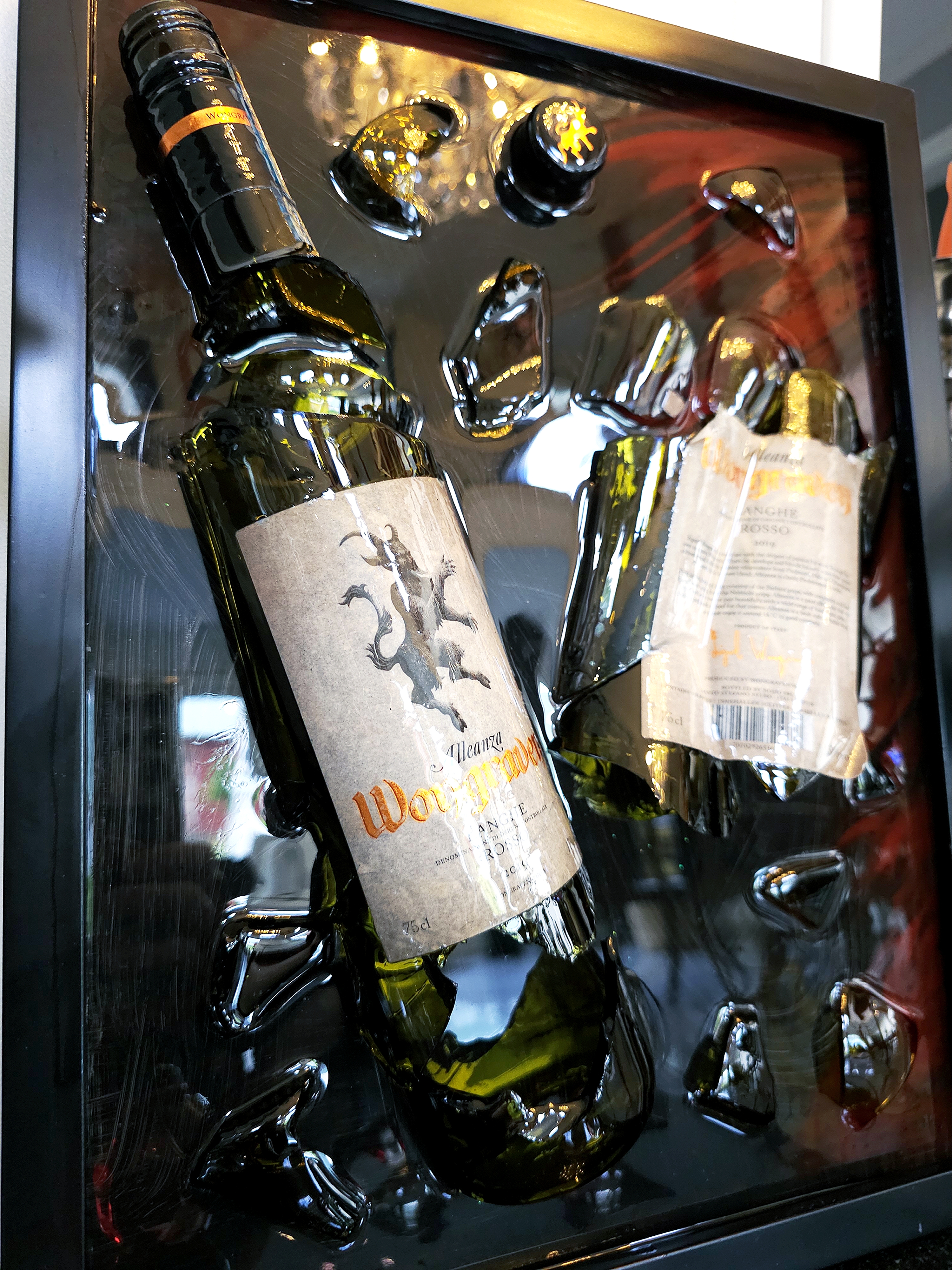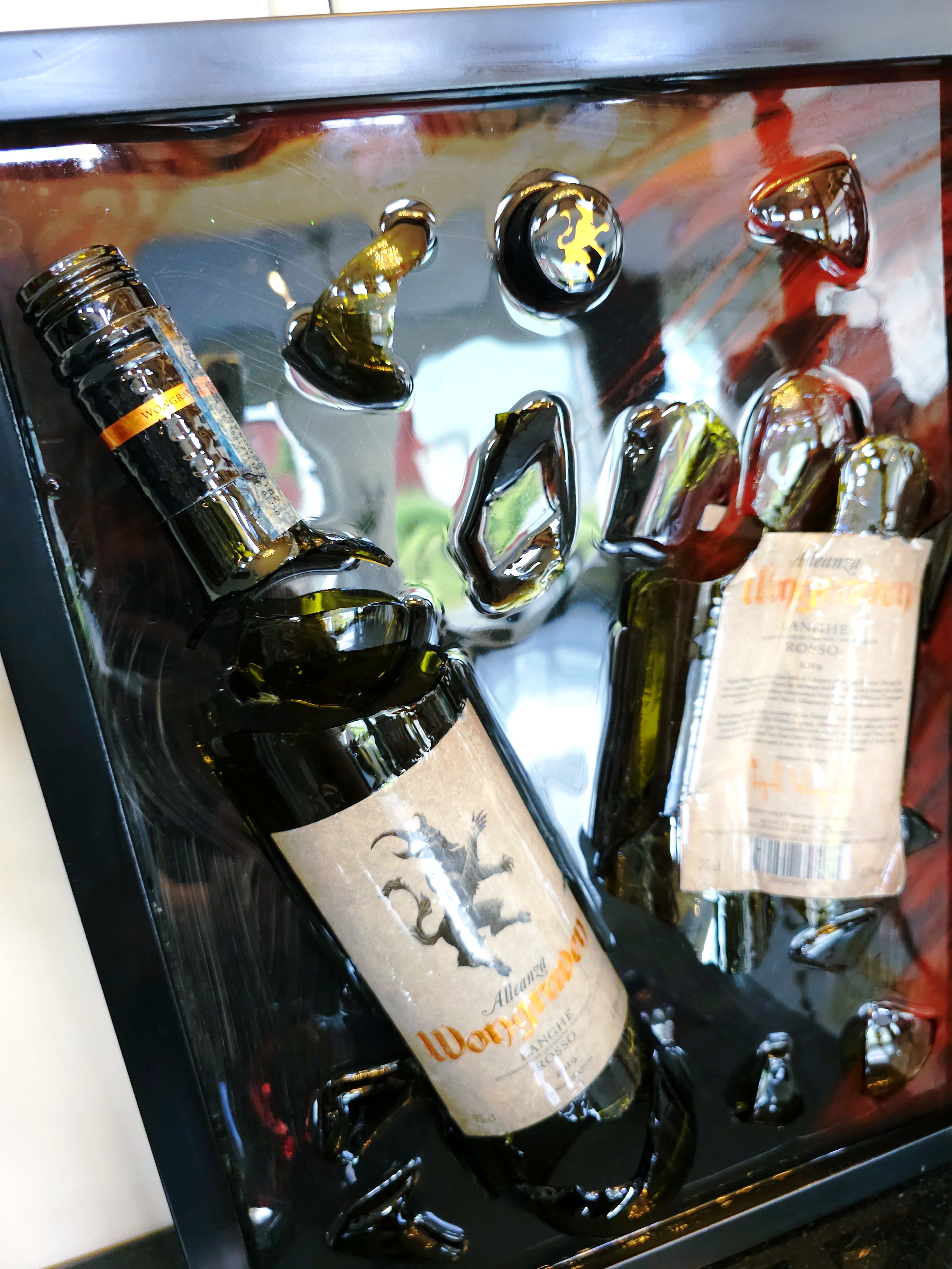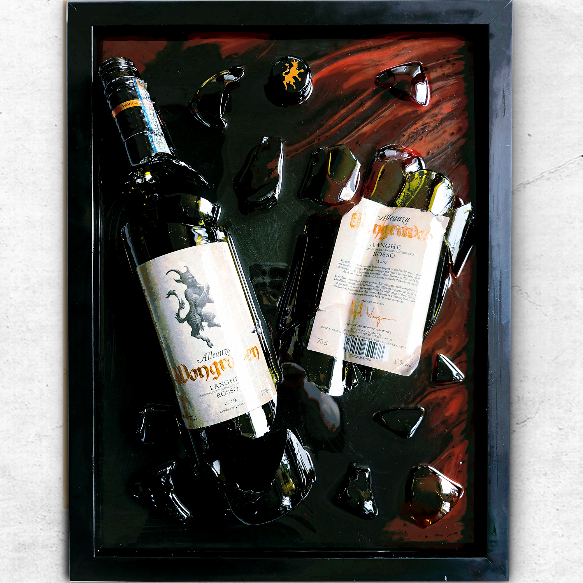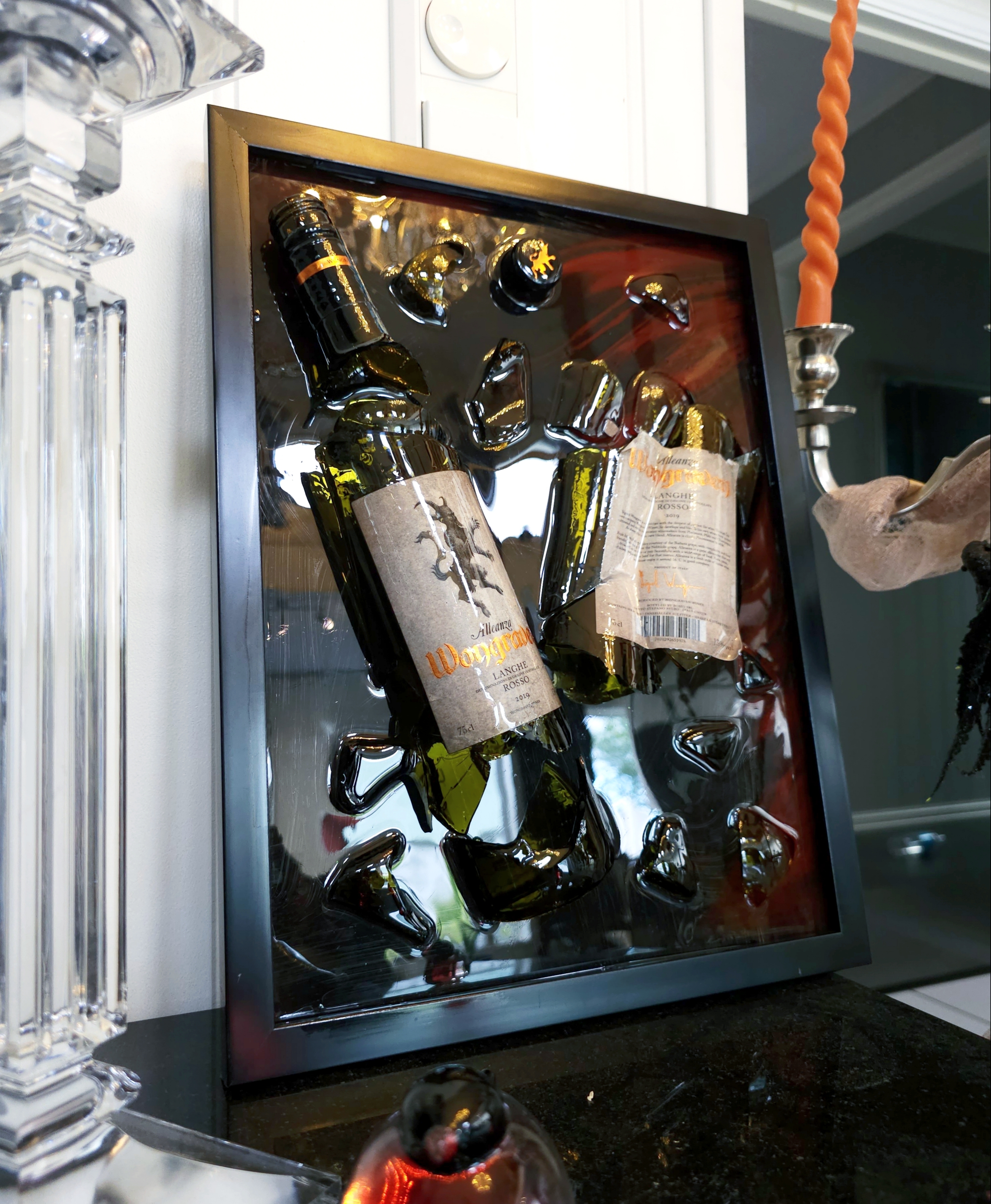 This wall art picture features a red wine glass bottle, broken and arranged in a black wooden frame, covered in a layer of crystal-clear epoxy resin, set against a deep black and red background. Wine bottle: Wongraven.
